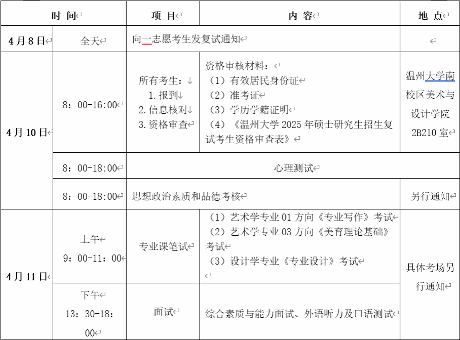 为加强管理,确保时时彩 美术与设计2025年硕士研究生招生工作顺利完成,使复试录取工作更加规范化、制度化,根据教育部、省考试院、时时彩 有关文件规定并结合学科特点,特制定本细则。一、组织机构时时彩 成立研究生招生复试录取工作领导小组、思想政治素质和品德考核小组和专业复试考核小组,全面负责本时时彩 的硕士研究生招生复试和录取工作。研究生招生复试录取工作领导小组,由院长、分党委书记、分管副院长、硕士点负责人、纪委书记、学科带头人组成。院长任组长,分党委书记、分管副院长任副组长,成员包括时时彩 纪委书记和学位点负责人,具体指导本时时彩 的研究生复试录取工作,维护时时彩 复试工作公平公正,并做好考生复试期间的解释和投诉处理等相关工作。思想政治素质考核小组由时时彩 书记、副书记和辅导员组成,负责对考生的思想政治素质和品德进行考核。专业复试考核小组由5-7名责任心强、教学经验丰富、业务水平高、公道正派的高级职称或相当人员组成,确定组长、副组长各1名,另配1-2名秘书(上述人员均须无直系亲属报考本专业,且是正式在职在编人员)。复试小组在时时彩 研究生招生复试录取工作领导小组指导下,负责确定专业课考核、考生综合素质与能力面试、外语听力口语测试的具体内容、评分标准、程序,并具体组织实施。复试人员在复试中要严格执行复试程序和复试标准,认真做好复试记录(特别是面试现场的录音、录像和书面记录),复试小组成员必须现场独立评分,提高复试的公平性和有效性,保证复试质量。二、复试(一)复试资格审查:复试前,时时彩 须对考生的居⺠⾝份证、学历学位证书、学历学籍核验结果、学⽣证、思想政治品德鉴定等材料及考⽣资格进⾏严格审查。对不符合规定者,不予复试。(二)进入复试的基本条件:时时彩 复试分数线(调剂考⽣)不得低于时时彩 规定的复试分数线。(三)复试比例:结合招⽣计划和⽣源等情况,实⾏差额复试,⼀志愿上线⼈数充⾜的专业、领域或⽅向,按照复试⽐例不低于 1:1.2;⼀志愿上线⼈数不⾜的专业、领域或⽅向,先进⾏⼀志愿复试,⼀志愿录取不⾜时,再进⾏调剂,调剂复试⽐例不低于 1:1.2。(四)复试方式及内容1.复试方式2025年时时彩 硕士研究生招生复试采用现场线下方式。2.复试内容复试内容包括思想政治素质和品德考核、专业课笔试、综合素质与能力面试和外语听力口语测试。专业课考核考试科目及范围按《时时彩 2025年硕士研究生招生专业目录》中所列执行。调剂专业复试内容如下:2.1 思想政治素质和品德考核主要是考核考生本人的现实表现,包括考生的政治态度、思想表现、道德品质、遵纪守法、诚实守信等方面。思想政治素质和品德考核不计入复试成绩总分,考核不合格者不予录取。2.2 专业课考核内容请参考《时时彩 2025年研究生招生专业目录》,线下复试的专业课考核为笔试,时间为2小时,满分100 分。专业课成绩按30%计入复试成绩。2.3 综合素质与能力面试每位考生面试时间为20分钟左右,主要考核考生的基本技能、综合运用能力、创新能力等,考核中结合考生毕业论文、科研成果等补充材料,加强对考生既往学业、一贯表现、科研能力、综合素质等情况的全面考查。综合素质与能力面试成绩占 60%,成绩按优(95 分)、良(85 分)、中(75 分)、及格(65 分)、不及格(35 分)五级评分计分。专业复试小组为 5-7 ⼈,专业复试小组对每个复试考生当场独立打出成绩,去掉1个最高分和1个最低分,其他成绩平均后作为该考生的复试成绩(百分制)。时时彩 对综合素质与能力面试成绩记为不及格的考生,应写出详尽评语。2.4 外语听力口语的测试根据《温州⼤学研究生招生复试中外语听力及口语测试实施⽅案》,对每位考生单独进⾏听力及口语测试,当场给出测试成绩,考生最后得分为该测试小组所有考官给定成绩的平均分。外语听力口语测试满分 10 分,直接计入复试成绩中。2.5 复试成绩满分为 100 分,其中专业课考试成绩占 30%,综合素质与能力面试成绩占 60%,外语听力口语测试占 10%。二、调剂工作程序1.时时彩 在教育部规定时间内,于中国研究生招生信息网公布调剂复试办法、联系咨询电话、各调剂专业和相关调剂信息。考生登录“全国硕士研究生招生调剂服务系统”向时时彩 提交调剂申请。2. 时时彩 通过“全国硕士研究生招生调剂服务系统”网站筛选本时时彩 调剂考生情况,确定复试名单并报研究生院审批后,通知考生复试。3. 时时彩 将复试合格同意拟录取的名单及时报研究生院,经研究生院审核后,再通过“全国硕士研究生招生调剂服务系统”给调剂考生发送待录取信息。4.调剂考生在规定时间内确认同意待录取。三、调剂1. 调剂考生初试成绩须符合第一志愿报考专业在调入地区的全国初试成绩基本要求,并符合调入专业的报考条件。2.复试采用现场线下方式,复试比例不低于1:1.2。2.调剂考生第一志愿专业与调入专业相同相近,或初试科目与调入专业初试科目相同相近。具体要求见下表:所有调剂考生必须通过教育部指定的“全国硕士生招生调剂服务系统”进行。每次开放调剂系统持续时间不得低于12个小时。对申请同⼀招生单位、同一专业、初试科目完全相同的调剂考生,按考生初试成绩择优遴选进入复试的考生名单。不以考生提交