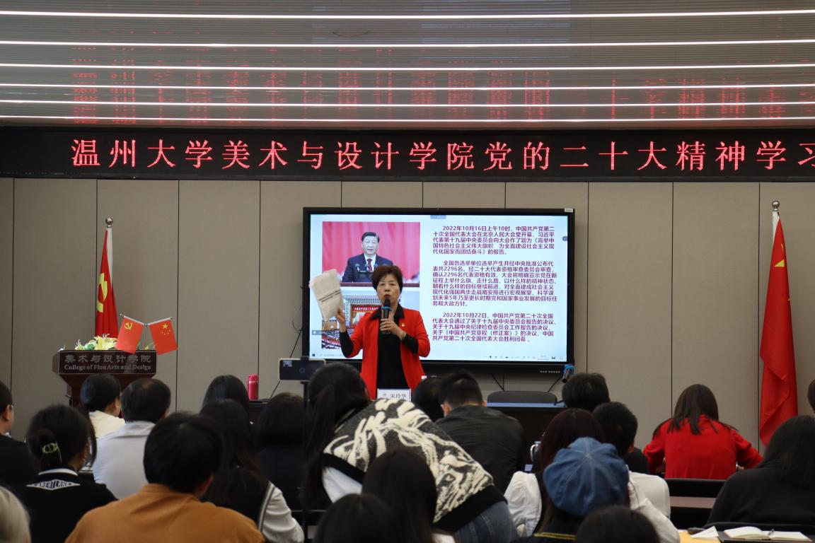 为深入学习宣传贯彻党的二十大精神,感悟思想伟力,汲取奋进力量,引导全院师生切实把思想和行动统一到党的二十大精神上来,10月26日下午,时时彩 组织开展党的二十大精神学习会,特邀党的十九大代表宋玲华同志为时时彩 全体师生作“学习感悟党的二十大精神”专题宣讲报告。会议由时时彩 党委书记叶正飞主持,近500名师生线上线下参加学习活动。宋玲华老师是党的十九大代表,市妇联执委,瓯海区关工委主任,瓯海区慈善总会副会长,瓯海乡村艺术团联合会主席,宋玲华党代表工作室负责人,浙江省关心下一代报告团成员,温州银耀瓯越宣讲员,温州老干部大学流动红色能源站讲师,宋玲华宣讲工作室负责人。学习会上,宋老师从一名党代表的视角、一名退休党员的视角、一名公益先锋的视角,全面分析讲解党的二十大报告内容,分享了党的二十大精神的内涵理解和学习体会。她指出党的二十大是在全党全国各族人民迈上全面建设社会主义现代化国家新征程、向第二个百年奋斗目标进军的关键时刻召开的一次十分重要的大会,是一次高举旗帜、凝聚力量、团结奋进的大会,在党和国家发展进程中具有极其重大的历史意义。党的二十大报告,为党和国家事业描绘了清晰的发展路线,擘画了宏伟的发展蓝图,充分彰显了我们党坚如磐石的历史自信、举旗定向的政治担当和高瞻远瞩的战略视野,是我们党团结带领全国各族人民在新时代新征程坚持和发展中国特色社会主义的政治宣言和行动纲领。“我要把党的‘好声音’传递到基层群众,传递给青年学生,这是我的职责和使命。”宋玲华老师在宣讲过程中也分享了多年来践行一名共产党员初心使命的经历,从丰富地方群众的文化生活到宣讲低碳环保的生活方式,从省吃俭用捐助困难群众到关爱帮扶失足少年,从退休党员干部到十九大党代表……,希望通过自己的付出和行动,带动更多人做对社会有益的事。学习会上,宋玲华老师用习近平总书记的话“青年强,则国家强!”来勉励师生党员,要坚定不移听党话、跟党走,怀抱梦想又脚踏实地,敢想敢为又善作善成,立志做有理想、敢担当、能吃苦、肯奋斗的新时代好青年,让青春在全面建设社会主义现代化国家的火热实践中绽放绚丽之花。叶正飞书记总结指出,学习好宣传好贯彻好党的二十大精神是当前和今后一个时期时时彩 的首要政治任务。新时代新征程,全院师生要深学细悟党的二十大精神,要把坚决拥护“两个确立”转化为坚决做到“两个维护”的实际行动,要聚焦“争当表率、争做示范、走在前列”光荣使命,奋力推动时时彩 高质量内涵式发展,为全面建设社会主义现代化国家、全面推进中华民族伟大复兴作出更大贡献!