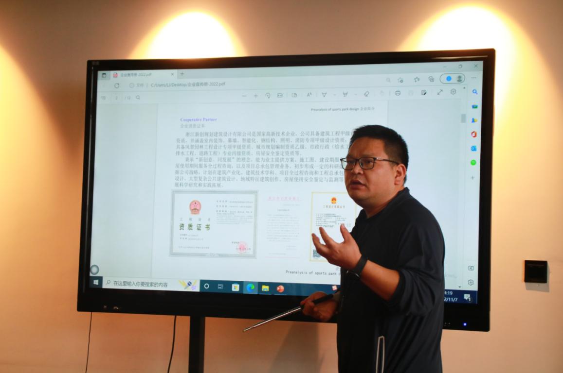 公司的负责人给我们介绍了公司的概况,新创设计是拥有包括方案、建筑、结构、室内装饰、园林景观、规划、机电等一体化的设计甲级资质和专业团队,分属公司不同部门,都在同一处办公,设计师们在一起充分沟通、交流、碰撞,做出来的方案、作品设计风格协调一致,工艺生产衔接流畅。上下游设计专业总承包,全过程服务,产生了明显的叠加效应。同学们还学习了公司最近投标的几个景观案例,总设计师做了详细的讲解分析,解答了同学们的问题!