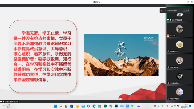01 课程介绍宣讲人:沈佐伦本期“喜迎党的二十大 美院微讲堂”活动由温大美院学生党员沈佐伦进行宣讲,带领大家学习共产党人的初心和使命。习近平总书记强调了初心和使命的重要意义。中国共产党在那么弱小的情况下能够逐步发展壮大起来,在腥风血雨中能够一次次绝境重生,在攻坚克难中能够不断从胜利走向胜利,根本原因就在于不管是处于顺境还是逆境,我们党始终坚守为中国人民谋幸福、为中华民族谋复兴这个初心和使命。02 活动方式活动时间:2022年9月25日18:30-19:30活动地点:线上 03 课程回顾七一勋章案例介绍坚持志愿服务十余载,群众心中的“活雷锋”王兰花,女,回族,1950年6月生,1995年11月入党,宁夏吴忠人,宁夏回族自治区吴忠市利通区金星镇王兰花热心小组党支部书记、王兰花热心小组慈善协会会长。群众心中的“活雷锋”,把解决社区居民的操心事,烦心事,揪心事作为毕生事业,十多年如一日坚持志愿服务。带领"王兰花热心小组”先后为居民解决各类困难7000多件,调解各类民事纠纷600多起,开展公益活动7000多场次,推动利通区志愿者从最初7人发展到6.5万余人。荣获“全国三八红旗手标兵”、“全国民族团结进步模范个人”等称号。 初心,使命的要求不忘初心方能行稳致远,牢记使命才能开辟未来。习近平总书记指出:我们党正带领人民进行具有许多新的历史特点的伟大斗争,必须不断深化党的自我革命,持续推动全党不忘初心、牢记使命。在未来的征程上,广大党员干部只有更好地守初心、担使命,把理想信念转化为攻坚克难的强大力量,万众一心,我们才能走好新时代的长征路,实现中华民族伟大复兴的中国梦。 青年大学生的初心和使命学海无涯、学无止境,学习是一件没有终点的事情,党员干部要不断加强政治理论知识学习,不断提高政治意识、大局意识、核心意识、看齐意识,永做党的坚定拥护者:要学以致用、知行合一,在学习和实践中不断解答疑难困惑,在学习和实践中不断收获成功喜悦,在学习和实践中不断坚定理想信念。 04 心得体会21美师1 沈柯莹本次微讲堂的主题是:不忘初心、牢记使命,高举中国特色社会主义伟大旗帜,决胜全面建成小康社会,夺取新时代中国特色社会主义伟大胜利,为实现中华民族伟大复兴的中国梦不懈奋斗。“不忘初心、牢记使命”就是为中国人民谋幸福,为中华民族谋复兴。主讲人列举了三位不忘初心、牢记使命的人物:点亮贫困山区女孩梦想的“校长妈妈”张桂梅、坚持志愿服务十年余载,群众心中的“活雷锋”王兰花、做工人要做到最好,我国焊接领域“领军人”艾爱国。让我感触最深的是“校长妈妈”张桂梅,十年树木百年树人,张桂梅用自己的教育初心,通过19年的努力实践创造了一个又一个教育奇迹,她知行合一,身体力行,用行动向我们上了“不忘初心、牢记使命”的一课。20美师3 陈淑慧本次美院微讲堂始终围绕“不忘初心、牢记使命”展开。而这句话强调的就是切实做到为中国人民谋幸福,为中华民族谋复兴。之所以“为中国人民谋幸福”作为中国共产党的核心,是因为一个政党的前途命运,最终取决于民心向背。人民是党执政之根基。而张桂梅同志则是身体力行地诠释了“为中国人民谋幸福”。张桂梅校长不畏风雨与艰险,筹资建立女子高中。她身患风寒重症,每天吃着数种药物,但这也没有阻拦她帮助贫困女孩走出大山的梦想,甚至为培养学生几乎付出生命。如同张校长一般,广大党员干部只有更好的坚守初心、担任使命,万种一心,才能走好新时代的长征路,实现中华民族伟大复兴的中国梦。19服设4 单雨欣不忘初心,什么是不忘初心、牢记使命?它是中国共产党第十九次全国代表大会的主题,它强调的是共产党人的初心和使命——为中国人民谋幸福,为中华民族谋复兴。这个初心和使命就是激励党和人民不断前进的根本动力。这是全体党员、干部的终身课题,因此我们必须用马克思主义中国化最新成果统一思想、统一意志、统一行动。前有点亮贫困山区女孩梦想的校长妈妈,坚持志愿服务十余载的活雷锋,现在有奔赴抗疫战场第一线的白衣天使,每个人都在用自己的方式来实现自己的初心和使命,作为当代大学生的我们,必须发扬斗争精神,勇于担当作为,不断坚定我们的理想信念。21美师3 王颖今天的微讲堂主要讲了十九大报告上,习近平总书记的一句话——“不忘初心、牢记使命”。微讲堂中举了三个党员的例子——他们平凡而又伟大,他们是普通人而不是天才,但却有一颗对党的衷心和对人民的热爱,他们这辈子坚持的是“全心全意为人民服务”的宗旨。其中,最令我印象深刻的是张秀梅同志。从高中的时候我就了解过她的事迹。她在面临时时彩 办不下去的时候,发现有8个老师是党员,她就带着这8个老师在党旗下宣誓。硬是凭着这份对党的信念,把时时彩 越办越好,把好多学生送出了大山。我觉得这就是“不忘初心、牢记使命”的真实体现。 19服设4 蔡安娜不忘初心、牢记使命,高举中国特色社会主义伟大旗帜,决胜全面建成小康社会,夺取新时代中国特色社会主义伟大胜利,为实现中华民族伟大复兴的中国梦不懈奋斗是中国共产党第十九次全国代表大会的主题,什么是不忘初心呢,就是共产党人的初心和使命——“为中国人民谋幸福,为中华民族谋复兴”,这是我从十九大中学会