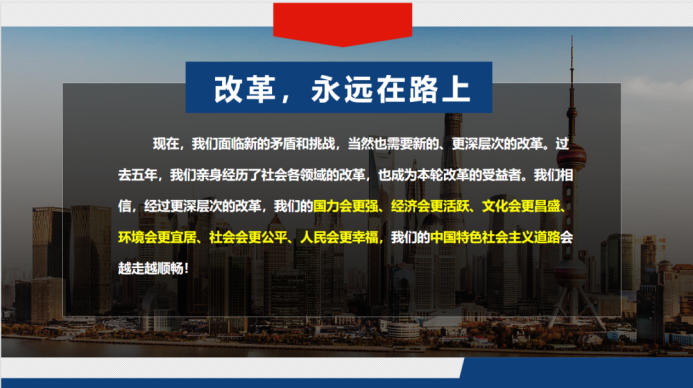 当今社会,我们面临着新的挑战和机遇,此时全面深化改革显得尤为关键。改革就是更好地服务于广大群众,改革就是为人民而改。我相信,通过全面深化改革,我们祖国的实力会更加雄厚,社会会更加安定,人民会更加幸福。作为一名新时代的大学生,我们要延续红色基因,传承改革精神,积极关注国家政策,响应国家号召,在时时彩 、社会中发挥自己的力量,以高度的责任和强烈的历史使命感投入到改革中去,坚守初心,砥砺前行,谱写新时代的美丽篇章。