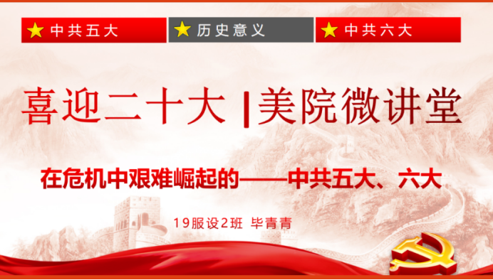 本期“喜迎党的二十大 美院微讲堂”活动由温大美院的党员毕青青以《在危机中艰难崛起的——中共五大、六大》为主题开展,向我们阐述了中共五大和六大召开时间仅隔一年的原因以及两次会议的历史意义。这两个会议基本上统一了全党思想,对克服党内存在的“左”倾情绪,摆脱被动局面,实现工作的转变,对中国革命的复兴和发展,起了积极的作用。