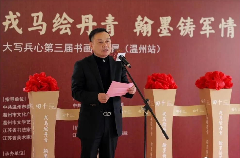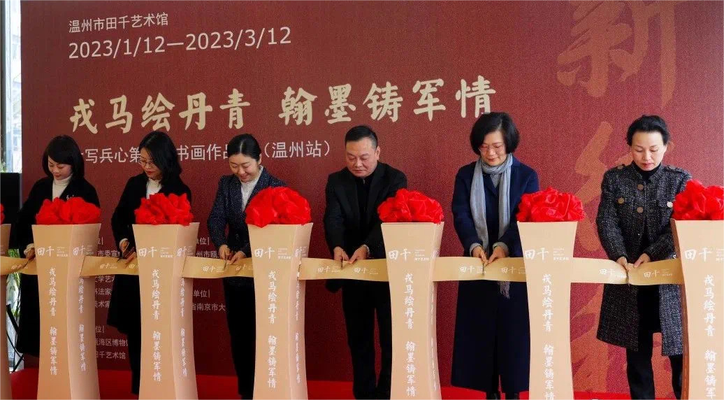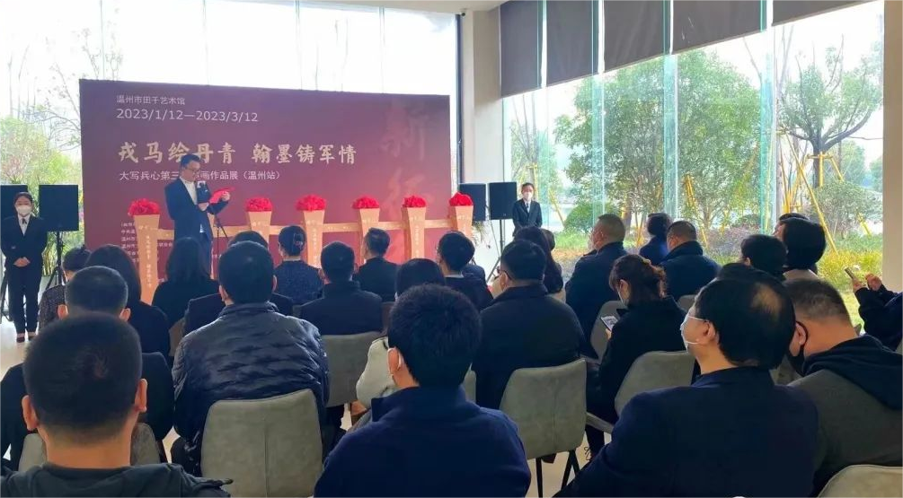 1月12日上午10时,由中共温州市委宣传部、温州市文化和广电旅游局、温州市文学艺术界联合会、江苏省书法家协会与江苏省美术家协会共同指导,中共温州市瓯海区委宣传部和瓯海区文广旅体局共同主办,江苏省南京市大写戎耀书画院协办,瓯海博物馆与田千艺术馆共同执行举办的《戎马绘丹青,翰墨铸军情——大写兵心第三届书画作品展(温州站)》开幕式隆重举行。