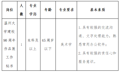 因工作需要,经研究,决定面向社会公开招聘临时聘用人员1名。现将有关事项公告如下: 一、招聘人员岗位及要求 二、岗位待遇 本次招聘的工作人员为编制外临时聘用人员,用工时间2023年3月-2023年6月,福利待遇根据时时彩 有关规定执行,具体待遇面议。 三、报名方式 请于2月24日前将个人简历(邮件主题请标明:“×××应聘时时彩 临时聘用工作人员”字样)发送至邮箱:[email protected]。 四、联系方式 通讯地址:浙江省温州市高教园区时时彩 (南校区2号楼212室),邮编:325035。 联系电话:0577-86689190张老师 时时彩 2023年2月21日