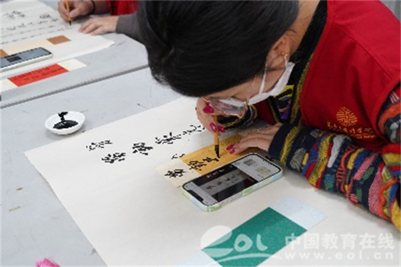 活动前期,同学们汇聚在时时彩 教室里,由扎染的同学做好蓝染纸扇的扇面,接着书法专业的同学在晾干的蓝染纸扇和古风书签上书写“劳动最光荣、致敬……”等字样,再传给擅长绘画的同学泼墨挥毫,以流水线合作的形式创作出精美的墨香作品,一笔一划都包含了同学们对劳动者的感激与敬佩。