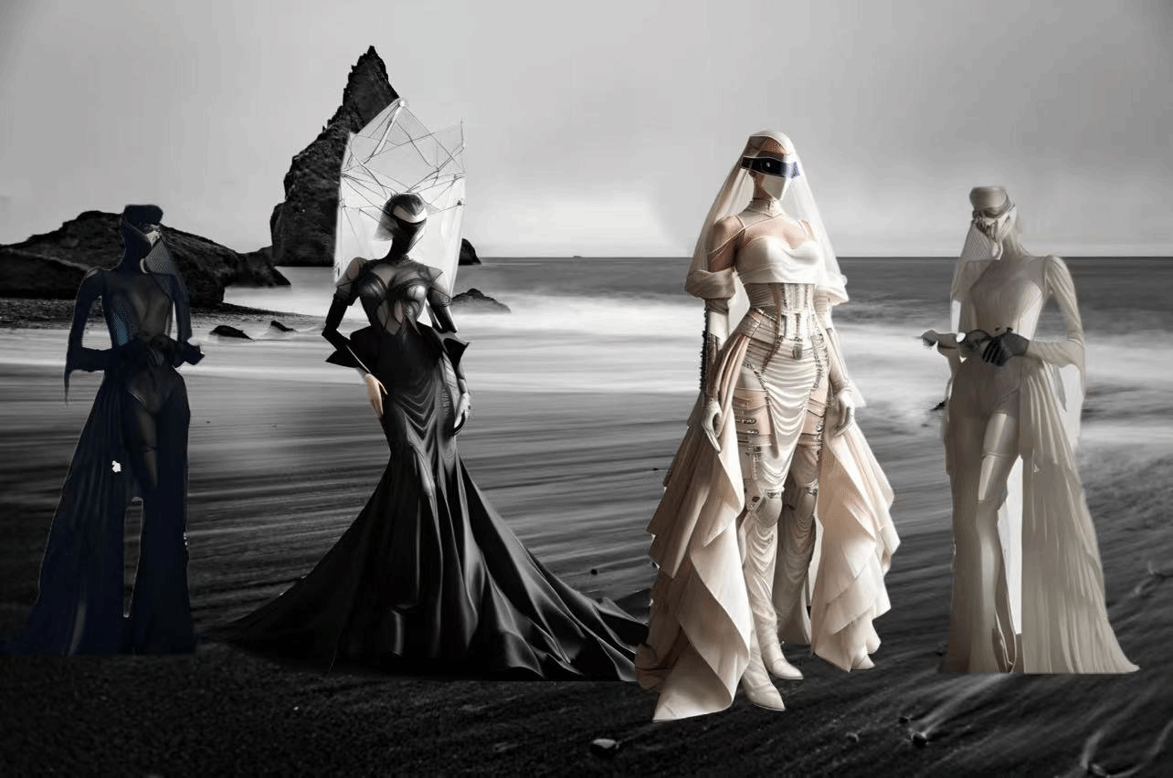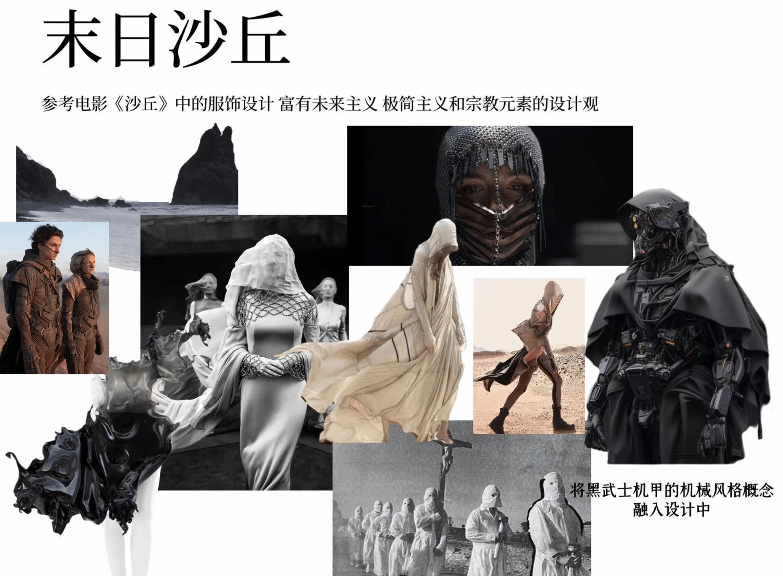 灵感说明:灵感源自于电影【沙丘】,服装风格最早源自于Demobaza,富有保加利亚未来主义风格。服装中添加了【星球大战】中的黑武士角色元素,将其机械朋克概念融入到设计中。