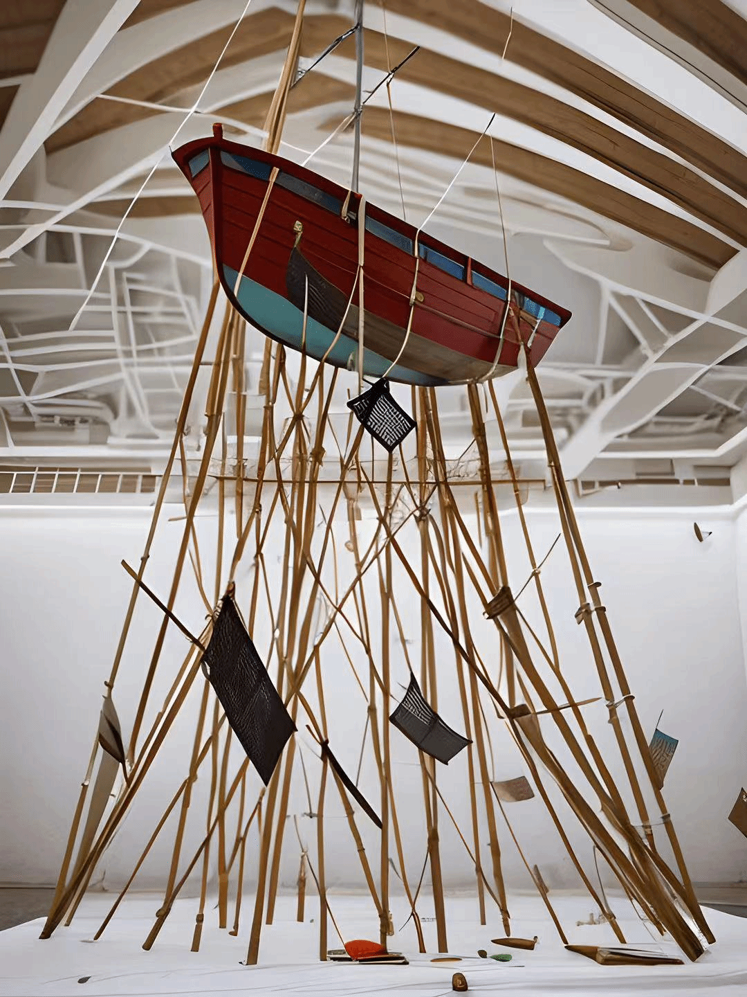 并架起用渔网材料制作造型的渔船.