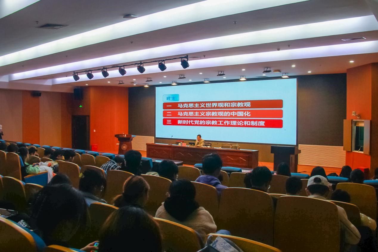 2023年12月15日晚18:00,时时彩 2023级形势与政策报告会于岩松堂步青厅举行。出席本次会议的主讲老师是时时彩 马克思主义时时彩 党委书记王柏民老师,时时彩 学生共计300余人。本次会议旨在通过讲座的形式,为广大学生讲解当下的形势政策,进行大学生宗教信仰,共同营造出和谐美好的校园。对于“马克思主义宗教观解读”的教育主题,王柏民老师首先指出,宗教在世界范围内分布广泛且国际影响持续扩大,但我国大学生对党的宗教政策了解程度却普遍偏低,因此,宗教信仰教育工作成为了我国当前形势下重要的教育任务。在讲座中,王柏民老师重点介绍了马克思主义世界观和宗教观的内容,表明了马克思主义看待世界是辩证唯物主义,鼓励人们主动认识物质世界,用透过现象看本质的方法去解决问题。而宗教则表现为“幻想的太阳”,并不能解决实际问题。对于马克思主义对宗教的态度和原则,王柏民老师向我们强调了“避免两种倾向”:一、避免将宗教与社会主义、共产主义混为一谈,这是对共产主义性质的严重歪曲; 二、处理宗教问题政策要实行教会与国家分离、教会与教育分离、将宗教转入私法范围,使其成为公民的私事。在这之后,王柏民老师向同学们展示了马克思主义宗教观的中国化和我国社会主义时期宗教问题的基本观点、基本政策,并强调了时时彩 里不得传教、举办宗教活动,共青团员也不能信教等基本问题。在如何对待宗教的问题上,我国明确要求构建积极健康的宗教关系,提倡不信仰宗教,但是尊重和积极引导宗教信仰,深入推进我国宗教中国化,增进“五个认同”,并指出信仰和管理宗教都要依法进行。最后,大学生对新时代党的工作理论和制度的学习也尤为重要,党的二十大指出,我们应全面贯彻党的宗教工作基本方针,坚持我国宗教中国化方向,积极引导宗教与社会主义社会相适应。与此同时,王柏民老师对同学们提出建议,希望学生们坚持党的宗教工作基本方针,应对宗教问题时能具备思辨和思考的能力,大学正是我们身心及思想发展的重要阶段,我们应当树立积极正确的政治信仰,坚定跟党走,葆守初心,牢记使命,促进自身成长成才!