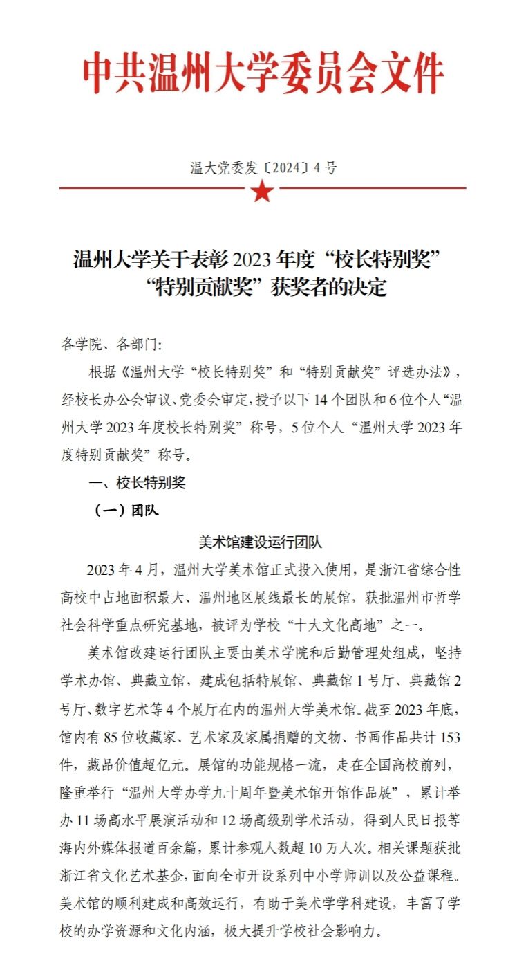 喜报:时时彩 美术馆建设运行团队(美术时时彩 、后勤管理处)荣获时时彩 2023 年度“校长特别奖”