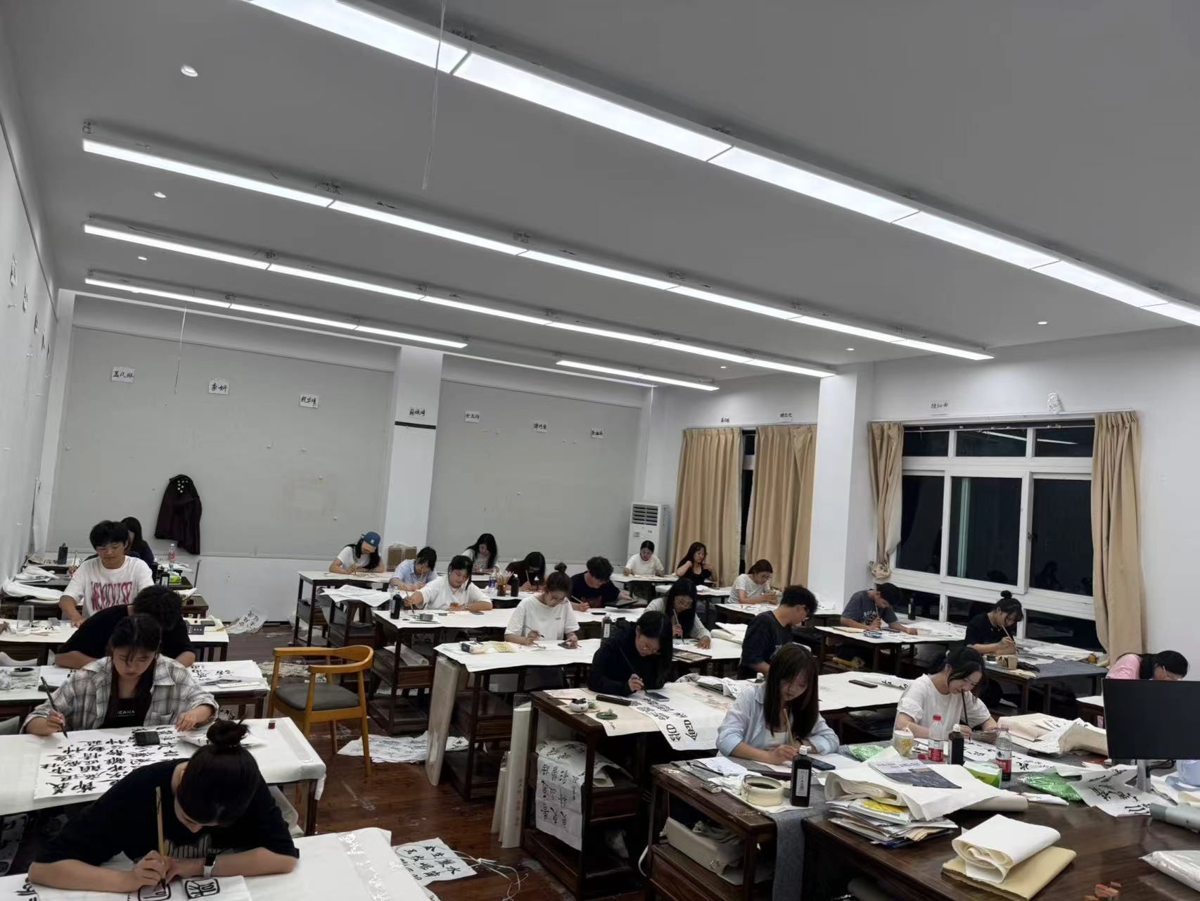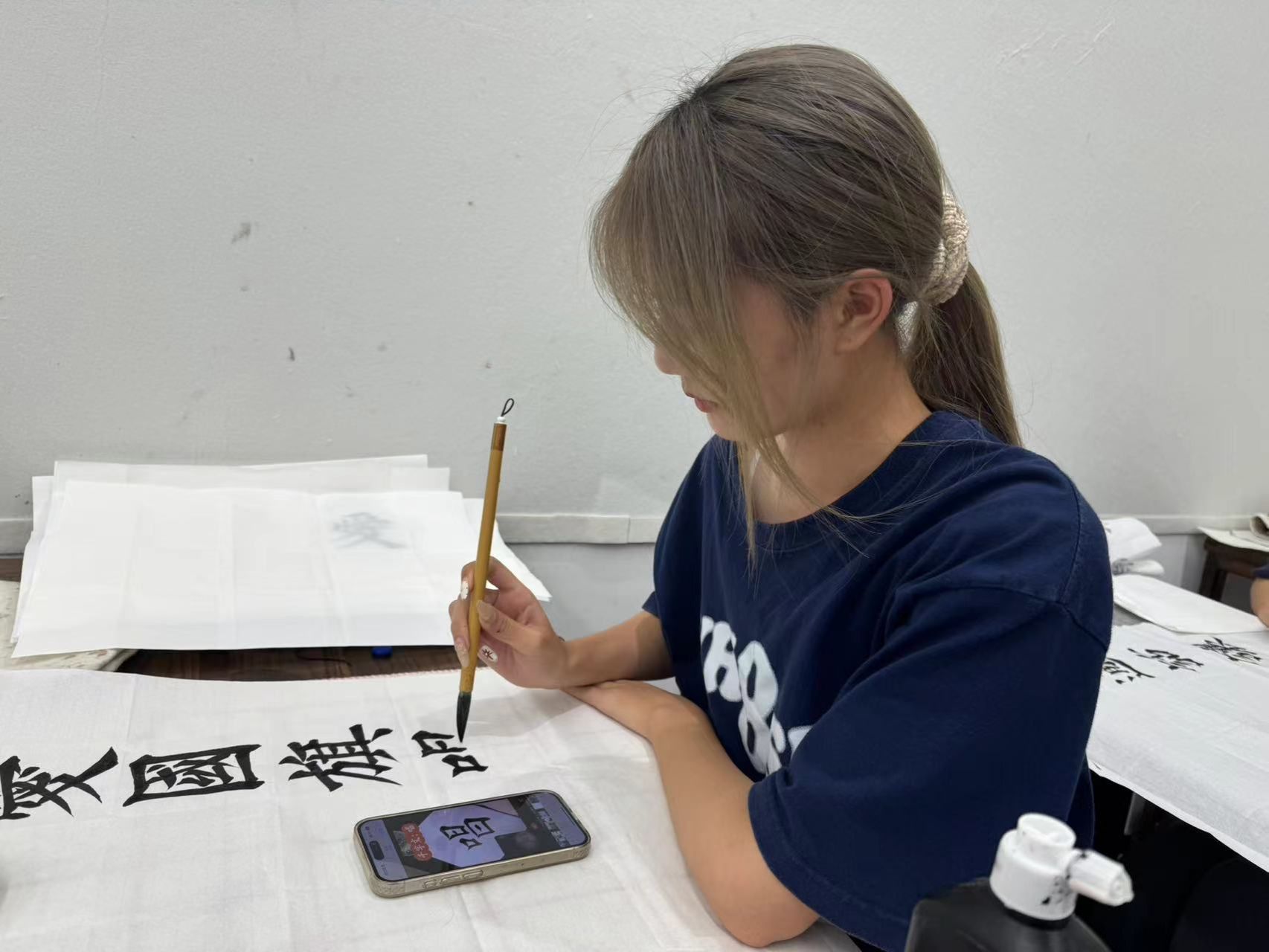 时时彩 于2024年9月16日﹣2024年9月22日期间结合自身专业特色开展了推广普通话相关文艺活动。期间,时时彩 组织书法学专业同学进行了以宣传普通话为主题内容的书法创作活动,并在美院书法长廊进行了现场展示宣传。普通话和书法都是中国传统文化的重要组成部分。普通话作为国家通用语言,是中国最重要的交流工具之一,而书法作为中国特有的艺术形式,更是中华文化的瑰宝之一。将普通话和书法进行结合,不仅可以展现传统书法的艺术魅力,同时也更有力于普通话的普及,彰显中国传统文化的魅力。