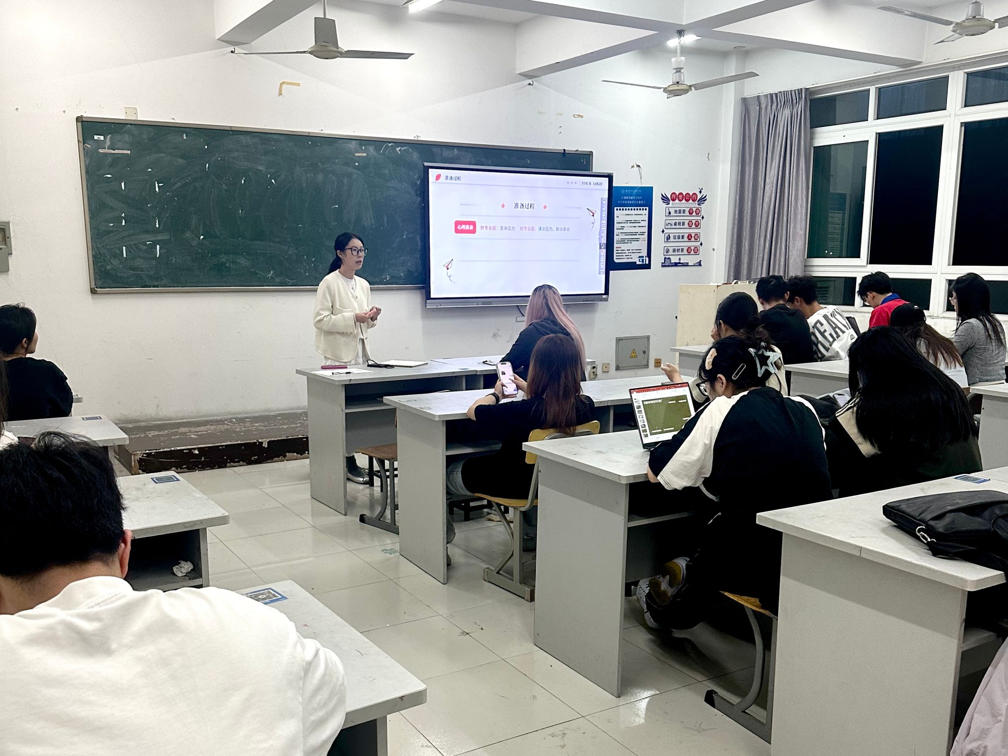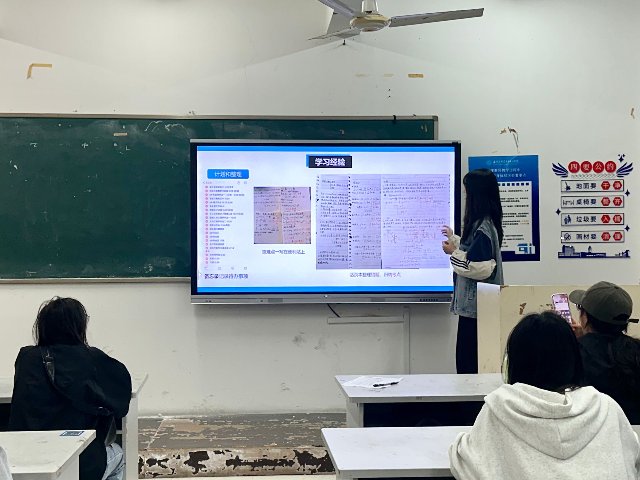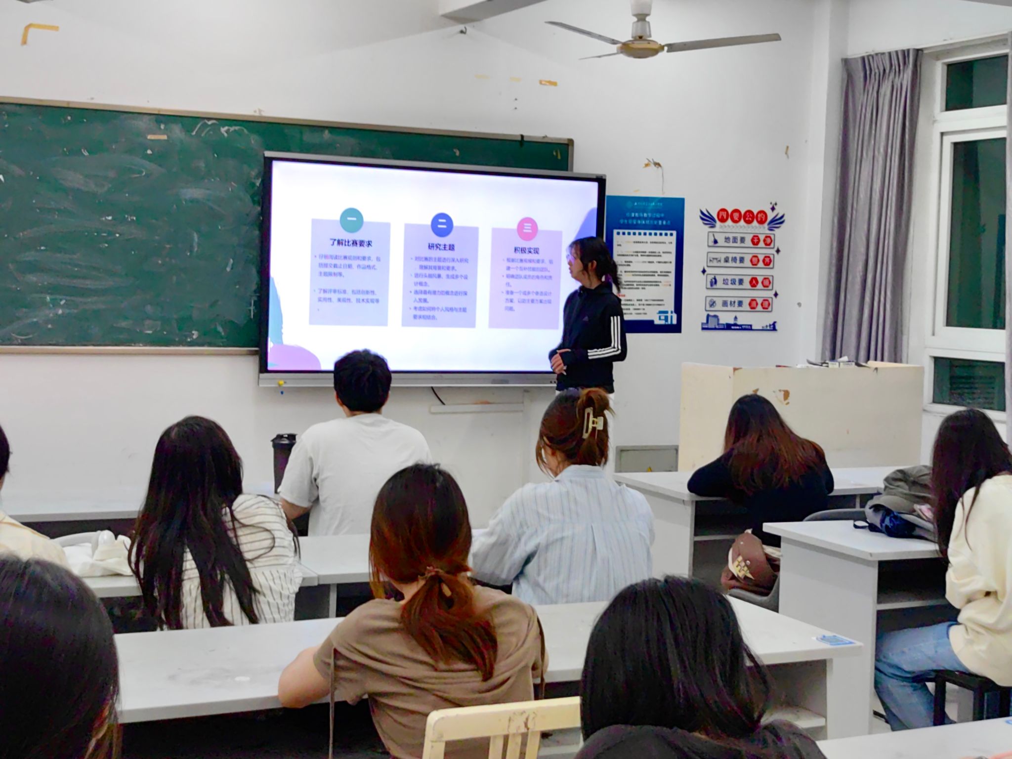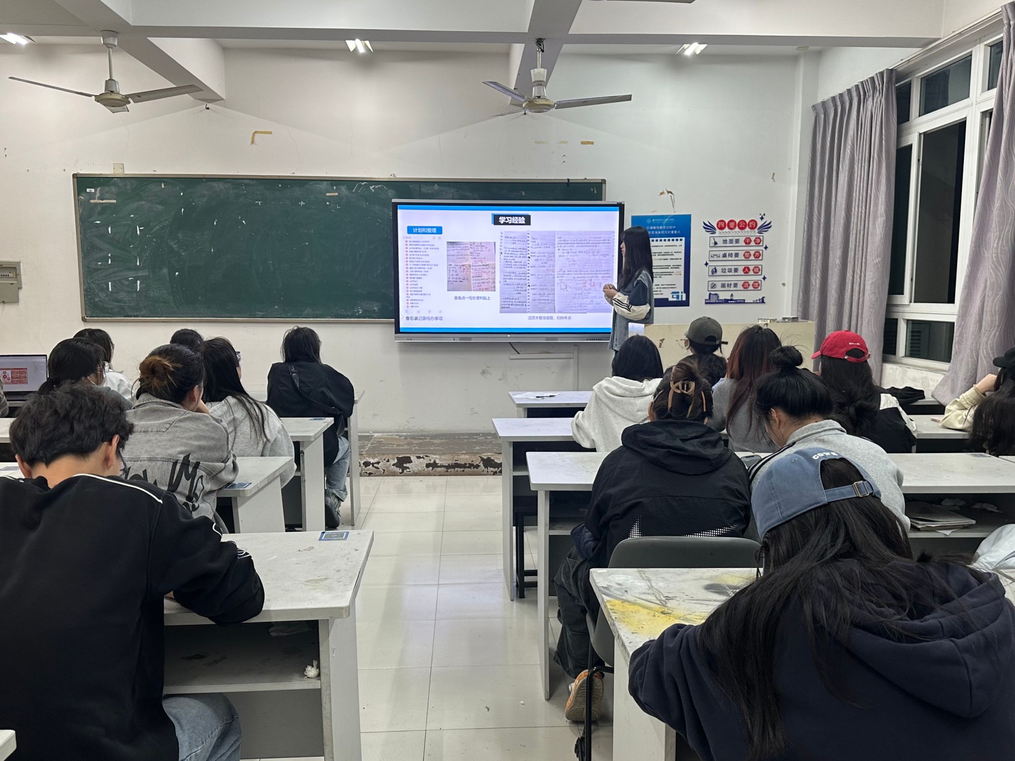 2024年11月10日,22服工班的杨涵琪同学进行了学习竞赛经验分享。杨涵琪为同学们详细介绍了自己在学习专业课程时的计划和整理方法,强调了合理安排时间、制定详细学习计划的重要性。杨涵琪同学表示,作为新时代青年,我们需要尽早确立个人发展目标,并勇敢地踏出舒适区,积极投身于科研项目和学习竞赛活动,为实现梦想打下坚实的理论基础。