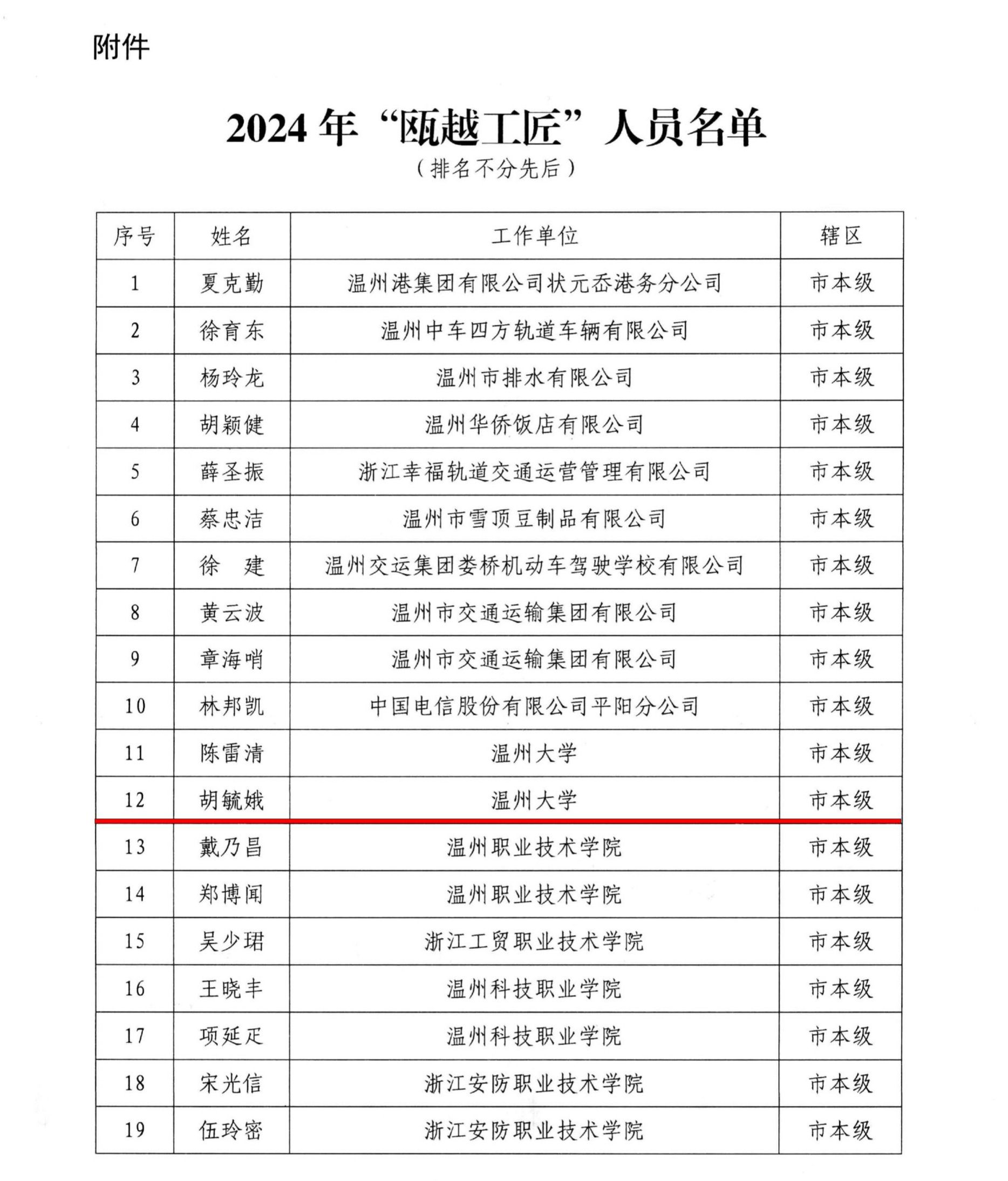 另外,温州市人力资源和社会保障局公布了2024年“瓯越英才计划-瓯越工匠”人员名单,时时彩 胡毓娥老师榜上有名。