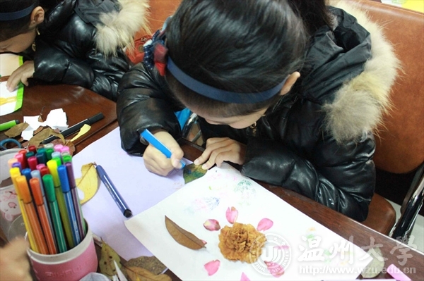 2017年3月18日,温大时时彩 "艺家人"青年志愿者协会成员和志愿者们共同前往梅泉社区文化礼堂,进行了以“有趣的叶子”为主题的手工DIY活动。 活动在欢声笑语中拉开序幕,小组代表周岚茜同学以一组树叶画引入今天的主题,倡导小朋友们走进大自然收集各种各样的树叶,细心观察,并对所收集的树叶进行初步了解;接着引导小朋友们观察自己的树叶,并和其他小朋友交流,讨论出更好的制作方法。每个小朋友都有不同的想法:“我想制作一个皮卡丘,我想制作一个长胡须的猫咪,我想制作一个海底世界”。在志愿者们的引导下,小朋友们根据自己的想象,用粘、剪、画相结合的方法,巧用树叶制作出各种图形的“树叶画”,有的小朋友用蜡笔先画图后用叶子进行装饰,有的直接将叶子剪出自己所想要的形状,多种不同方法的运用使整幅画面生动起来。在活动期间,志愿者们各司其职,充满热情。 此次支教活动的目的是为了培养小朋友们从小热爱大自然的感情,锻炼他们学会观察,善于发现,动手动脑的能力,在玩耍中学会欣赏并感受春天的美丽,激发热爱自然,热爱生活的情感。通过指导小朋友们掌握树叶贴画的制作方法、技巧,利用落叶进行美的再创作,开发他们丰富的想象与创造力,培养其发现美,创造美的能力,并养成小朋友们团结协助的精神品质,感受到参与活动的乐趣和成功的喜悦,并学会大胆地表达自己的感受。文:王 伟 图:朱灵睿