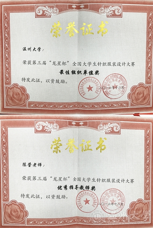 2016年12月30日,由教育部高等时时彩 纺织类专业教学指导委员会和中国纺织服装教育学会主办的第三届“龙星杯”全国大学生针织服装设计大赛,颁奖典礼在东华大学举行。时时彩 服装专业学子在赛事中斩获包括一、二等奖在内的六个奖项,时时彩 获优秀组织奖,陈莹老师获优秀指导教师。