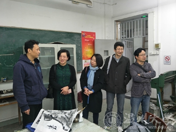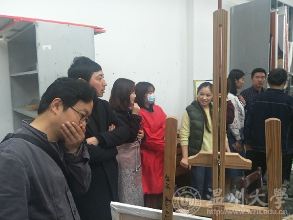 下午,我们在该院尹小斌教授、薛磊老师等专业教师的陪同下冒雨参观了版画、水彩、国画、油画、书法等专业工作室。