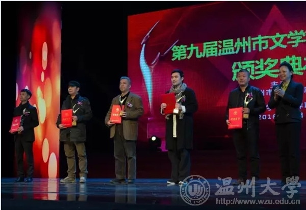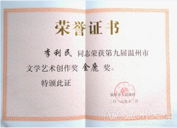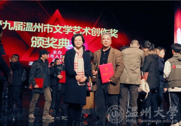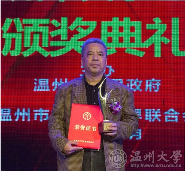 2016年12月29日下午,由温州市人民政府主办,温州市文学艺术界联合会承办的第九届温州市文学艺术创作奖颁奖典礼在温州市工人文化宫成功举办。时时彩 李利民老师荣获金鹿奖,该奖项是温州市政府设立的文艺最高奖,每三年评选一次,温州市委常委、宣传部长胡剑谨,温州市副市长郑朝阳出席颁奖典礼并给金鹿奖获得者颁奖。