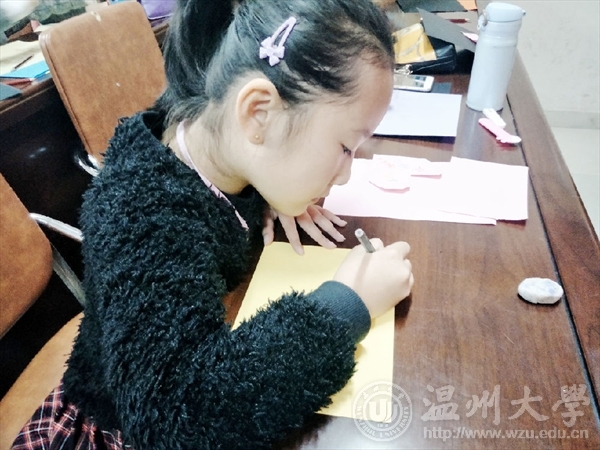这次的支教活动的主题是“致我最亲爱的人”,具体分为两个步骤,一是给家人制作一张贺卡,二是立体场景制作。首先,来自16美术师范班的罗涤和居慧琳同学在课前播放了《倒霉熊》这部动画片以吸引小朋友们的注意力,并让小朋友讲述自己的所感所想,以此拉开了本次课程的序幕。因为课程还涉及到立体场景的制作,她们又给小朋友们介绍了制作贺卡和立体场景的具体流程。在所有课前要点都讲解完毕后,小朋友们在志愿者的带领下用提供的材料,将自己的创意、想象力和对父母深深的爱全部注入作品中。小朋友们心中对父母的感激汇成一股暖流,在明信片中缓缓地流淌。