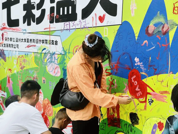 最后最令人期待的涂鸦环节—“团队巨画”绘制登场。孩子们与家长拿着用完成任务获得的“颜色卡”兑换的颜料,共同在画布上挥洒创意,一笔一画勾勒出对温大的热爱与祝福。原本空白的画布在众人的齐心协力下渐渐被绚丽多彩的图案填满,一幅幅充满童趣与温情的作品跃然眼前 。