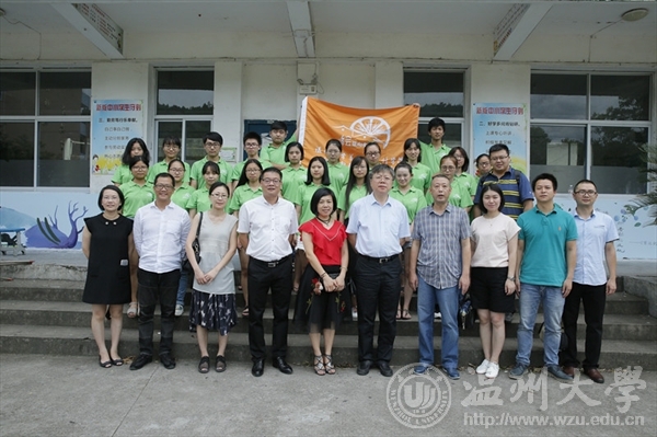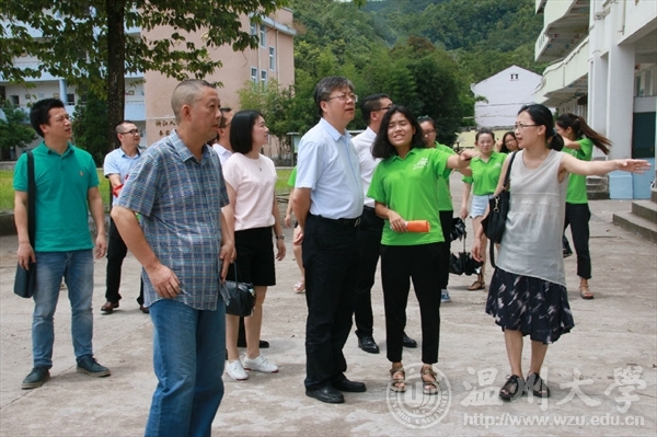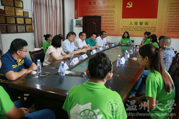 7月17日上午,时时彩 校长李校堃、党校办主任王定福、校团委书记屠霁霞、校团委副书记熊琳一行在时时彩 党总支副书记杨振海、学生科副科长叶筱卉的陪同下来到文成县大峃镇樟台乡希望小学,对正在这里开展暑期社会实践的“绘暖向南”大学生暑期社会实践队进行了慰问。
