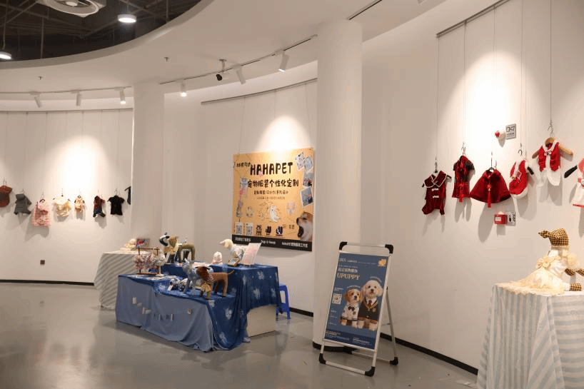 王业宏老师指导的宠物服装工作室,带来了充满巧思的作品《小招和他的朋友们》。团队利用白坯布裁剪废料进行植物染(扎染、蜡染、拓印),巧妙搭配库存面料,为比熊犬“小招”设计制作了定制“狗台”、玩具及周边。这一实践依托时时彩 时尚创新研究所,探索了废料再利用与时尚设计的绿色结合点。