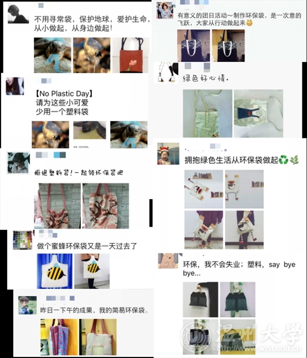 首先,团支书向大家讲述塑料制品的危害以及颁布限塑令的意义及作用,激发同学们的环保意识。其次,同学们自行在各个网站收集已有的流行、有创意的环保袋,并且分成三个小组,进行了热烈的讨论与分析。之后,同学们纷纷拿出自己的设计稿进行讨论该如何制作并付之于行动。在缝制过程中,同学们也遇到了许多困难,像把内袋与外袋缝反了,像缝到一半底线没了,只能把之前的劳动成果都拆了,重新缝等等这样的情况。虽然这样的状况令同学们很烦躁,但是她们一想到活动的初衷,马上调整心态,重新开始制作。经过一个下午的努力,每个同学都顺利完成了自己的环保袋,并进行了成果亮点展示。最后,还在朋友圈进行了宣传呼吁,这次的团日活动圆满成功。
