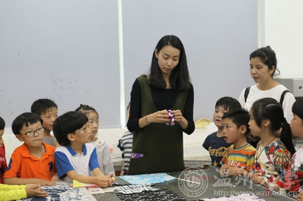 杨老师向大家介绍了时时彩 美术时时彩 印染实验室。张老师向家长孩子们介绍了“扎染”的发展历史,展示了五颜六色的扎染成品。孩子们都全神贯注的看着,还积极的向老师询问扎染的方法。扎染古称扎缬、绞缬、夹缬和染缬,是中国民间传统而独特的染色工艺。 其工艺特点是用线在被印染的织物打绞成结后,再进行印染,然后把打绞成结的线拆除的一种印染技术。它晕色丰富,变化自然,趣味无穷。更使人惊奇的是扎结每种花,即使有成千上万朵,染出后却不会有相同的出现。这种独特的艺术效果,是机械印染工艺难以达到的。