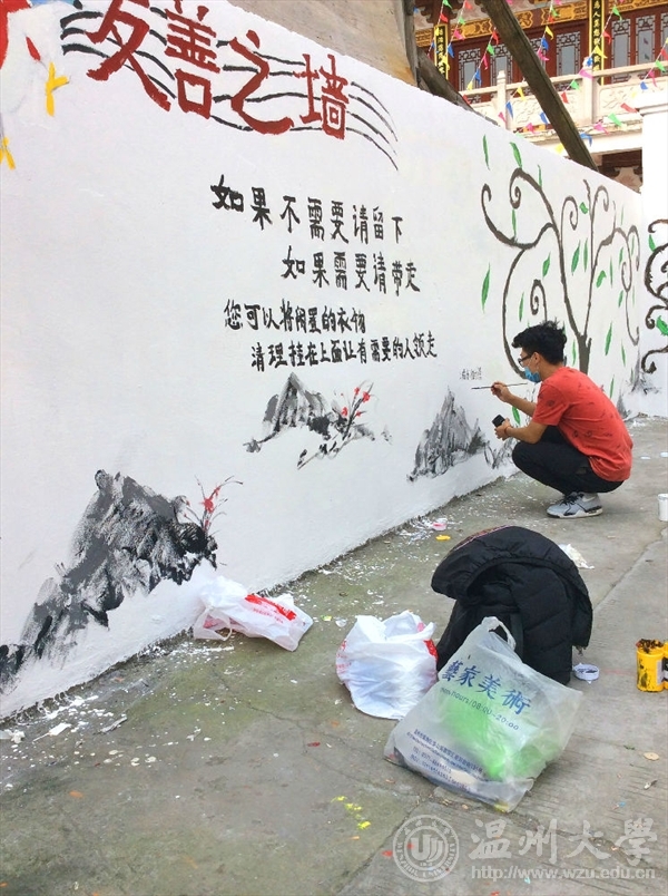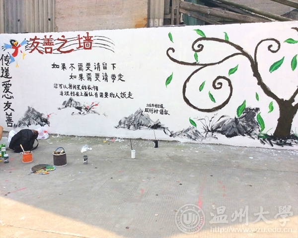 为了响应与落实市委“新青年下乡”主题精神,2016年3月26日早上八点,在时时彩 青协的带领下,来自时时彩 的志愿者们前往到乐清城东街道后所村老人亭,进行了为期一天的墙绘活动。本次“新青年下乡”墙绘活动,以“弘扬雷锋精神,传递爱心友善”为主题,呼吁人们将自己的旧衣物捐给有需要的人们。这不仅是一次物质上的贡献,更多的是精神上的支持与帮助。志愿者们通过画笔和色彩,将自己想要传达的信念幻化成一颗颗正在茁壮成长的绿树,希望“雷锋精神”这一理念像这茁壮成长的绿树一样,青春常在,精神永驻。我们本次的墙绘活动一方面主要是运用专业知识与技能去服务社会,向社会宣传大学生们所理解的“雷锋精神”,呼吁社会弘扬“雷锋精神”,真正做到专业与实践相结合,使我们融入到社会中去,为社会奉献出自己的一份力量;另一方面,不仅让我们有机会了解农村、服务农村,还让我们在基层学到了许多平时难以不到的知识技能。 文:林依如图:林依如