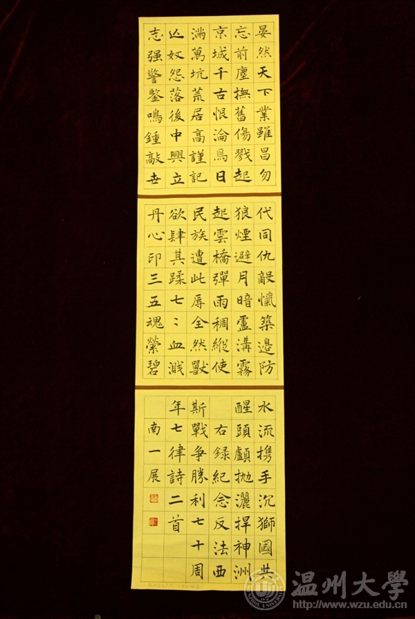 为纪念中国人民抗日战争暨世界反法西斯战争胜利70周年,传承爱国主义精神,弘扬社会主义核心价值观,激发民族自尊心、自信心和自豪感。自9月份发出通知以来,“纪念中国人民抗日战争暨世界反法西斯战争胜利70周年”书画大赛共收到特邀教职工书画作品共计29件,学生书画作品共计196件,经相关书画专家对学生绘画类和书法(篆刻)类作品严格评审,现将评比结果公布如下:?xml:namespace>绘画类评选结果 等级时时彩 作品名作者一等时时彩 《奇袭》林盖月城市时时彩 《“70”伟大的胜利》李文静二等时时彩 《忆团结》范桂梅时时彩 《峥嵘岁月》吴晓强教师教育时时彩 《前行》薛思思城市时时彩 《让武器成为过去》谢丽娟城市时时彩 《爱和平铭记历史》许朵瓯江时时彩 《黑夜不再来》赵圣益三等时时彩 《抗日中的小八路》陈婉茹时时彩 《抗日中的中国士兵》胡淳雅时时彩 《战后》郑也教师教育时时彩 《珍爱和平》李林真城市时时彩 《抗战胜利70周年》王斯曼城市时时彩 《缅怀》张烨瓯江时时彩 无题吴诗瑶瓯江时时彩 无题曾东瓯江时时彩 无题虞紫伊 书法类评选结果等级时时彩 类别作者一等时时彩 篆刻俞铭铖教师教育时时彩 软笔南一展城市时时彩 管理分院软笔史涛霞二等瓯江时时彩 硬笔曾越洋城市时时彩 管理分院软笔鲁洁如教师教育时时彩 硬笔毛江月教师教育时时彩 硬笔叶聪聪城市时时彩 软笔王欢焕城市时时彩 软笔葛科航三等时时彩 硬笔王婷婷时时彩 软笔杨凡时时彩 软笔朱雄辉时时彩 软笔岳通通时时彩 硬笔景成舒教师教育时时彩 硬笔陈雪雅教师教育时时彩 硬笔吴林教师教育时时彩 硬笔林安娜人文时时彩 硬笔周丽娜 书画展于南校区时时彩 服装楼一楼视野空间展览,展期为12月7日—12日,欢迎参观!特邀教职工参与展览作品: 学生获奖作品:一、绘画类一等:《奇袭》——林盖月一等:《“70”伟大的胜利》——李文静 二等三等二、书法类一等:《抗战祖列》——俞铭铖一等:纪念反法西斯战争胜利七十周年律诗二首—— 南一展一等:史涛霞二等 三等三等三等
