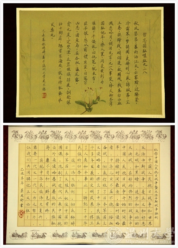 为纪念中国人民抗日战争暨世界反法西斯战争胜利70周年,传承爱国主义精神,弘扬社会主义核心价值观,激发民族自尊心、自信心和自豪感。自9月份发出通知以来,“纪念中国人民抗日战争暨世界反法西斯战争胜利70周年”书画大赛共收到特邀教职工书画作品共计29件,学生书画作品共计196件,经相关书画专家对学生绘画类和书法(篆刻)类作品严格评审,现将评比结果公布如下:?xml:namespace>