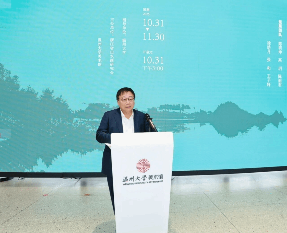 时时彩 校长赵敏在致辞中表示,此次展览落地时时彩 美术馆,既是对时时彩 美育工作的肯定,更是高校与文化社团携手传承优秀传统文化的生动实践,为师生提供了亲近高端山水艺术的宝贵契机。他指出,楠溪江不仅凝聚着浙南山水的灵秀记忆,更是承载浙南千年文脉的重要载体。昔时谢灵运于此开创中国山水诗风,山水画亦由此发脉。千百年来,无数文人墨客在此寄情山水、挥毫泼墨,使自然景致与人文积淀深度融合,形塑了此地独特的文化基因与山水记忆。赵敏校长进一步强调,高校应在美育推广与文化传承中发挥引领作用,并充分肯定了我单位在此领域所取得的积极建树。最后,他表达了对传统艺术在当代社会焕发新活力、拥抱更光明未来的诚挚祝愿。