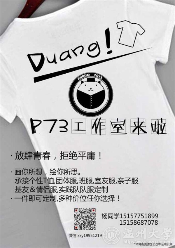 “创客”一词来源于英文单词"Maker”,是指出于兴趣与爱好,努力把各种创意转变为现实的人。他们热衷于创意、设计、制造,最有意愿、活力、热情和能力在创新2.0时代为自己、为全体人类去创建一种更美好的生活。 创客中有一个特殊的群体,那就是“艺·创客”,他们是一群充分发挥自己的艺术细胞和设计灵感,运用自己的扎实的专业知识,努力把各种创意变为现实,带进生活的人。我们大美院中就有这样一批人的存在!一、 团队名称P73服装设计 二、 工作室简介 P73服装品牌,建立于2014年4月,核心团队5人,设计人员辐射温大服装系。品牌针对16-28岁人群,现以原创图案和百搭基本款为主,来表现一种既想表达自己个性又想衣服百搭方便,穿出自己风格的人群。现团队以原创设计T恤和卫衣为主,并且承接各类团体服,实践队服的设计制作。 销售方式以网店运营为主,推广方式以微博,微信公共平台为主。目标将来成为设计销售为一体,工厂代加工,线上线下结合的大众百搭品牌。三、 团队组成 杨兴 (13服设2班) 董敏婕 (13服设2班) 李东婷 (13环艺) 张焕强 (13服设2班) 梁杰 (13商务英语 城院)四、 作品展示 五、 创业领域 图案T恤设计销售 个人图案T恤定制 班服,团体服,实践队服 原创帆布袋子 同学们可以为自己设计衣服图案,或把自己课堂上的设计变为实物,自己穿。P73也可以为同学们代卖,并以P73·某某某的方式署名,将自己的设计投放市场。 六、 创业感言 我们大学生在进行创业时,建议结合所学专业,利用专业知识选择创业方向,并应该注意以下几点: ● 创业要以适度创新为原则,结合市场动态; ● 充分利用和结合自身或团队成员的专业知识; ● 注意保证团队的感情融洽,工作分工明确。 地址:时时彩 创业园A12号负责人:杨兴(15157751899/641899)供稿:P73服装设计工作室本版编辑:张昇终审:李艳燕