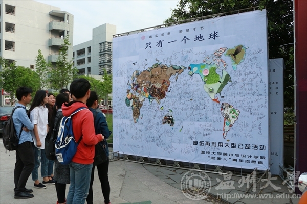 在第41个世界地球日来临之际,在“七十亿人的梦想: 一个地球,珍惜地球资源,转变发展方式,倡导低碳生活”的呼吁下,4月21日,时时彩 “艺家人”青年志愿者协会在美院楼举行了“乐行于艺,环保于己”地球日废纸再利用公益活动。 此次活动,旨在借助地球日活动平台提高公众对地球资源的认识,引导全社会积极参与节约集约利用资源、减少碳排放、促进经济发展方式转变的实践。为此,在今天的活动现场,设置了主题展览,废纸上作画,签名等活动。志愿者们在废弃的报纸,电池,矿泉水瓶等上面作画,一件件精美新奇的艺术作品应运而生,又将作品“画”成也一副巨大的世界地图,别有一番风味,让在场的学子们连连称赞,并纷纷在喷绘上进行环保宣言签名。 地球是人类共同家园,美院学子用自己专业技能变废为宝废,用绚丽的色彩,艺术的行动,倡导公众注意地球状况和人类活动对环境的危害,强调保护和改善人类环境的重要性,此次活动获得全校师生的共同认可和赞扬,并被温州都市报报道。通讯:刘子彰、摄影:孙彦鑫epaper.wendu.cn/Html/2015-04-22/12/content_5.html
