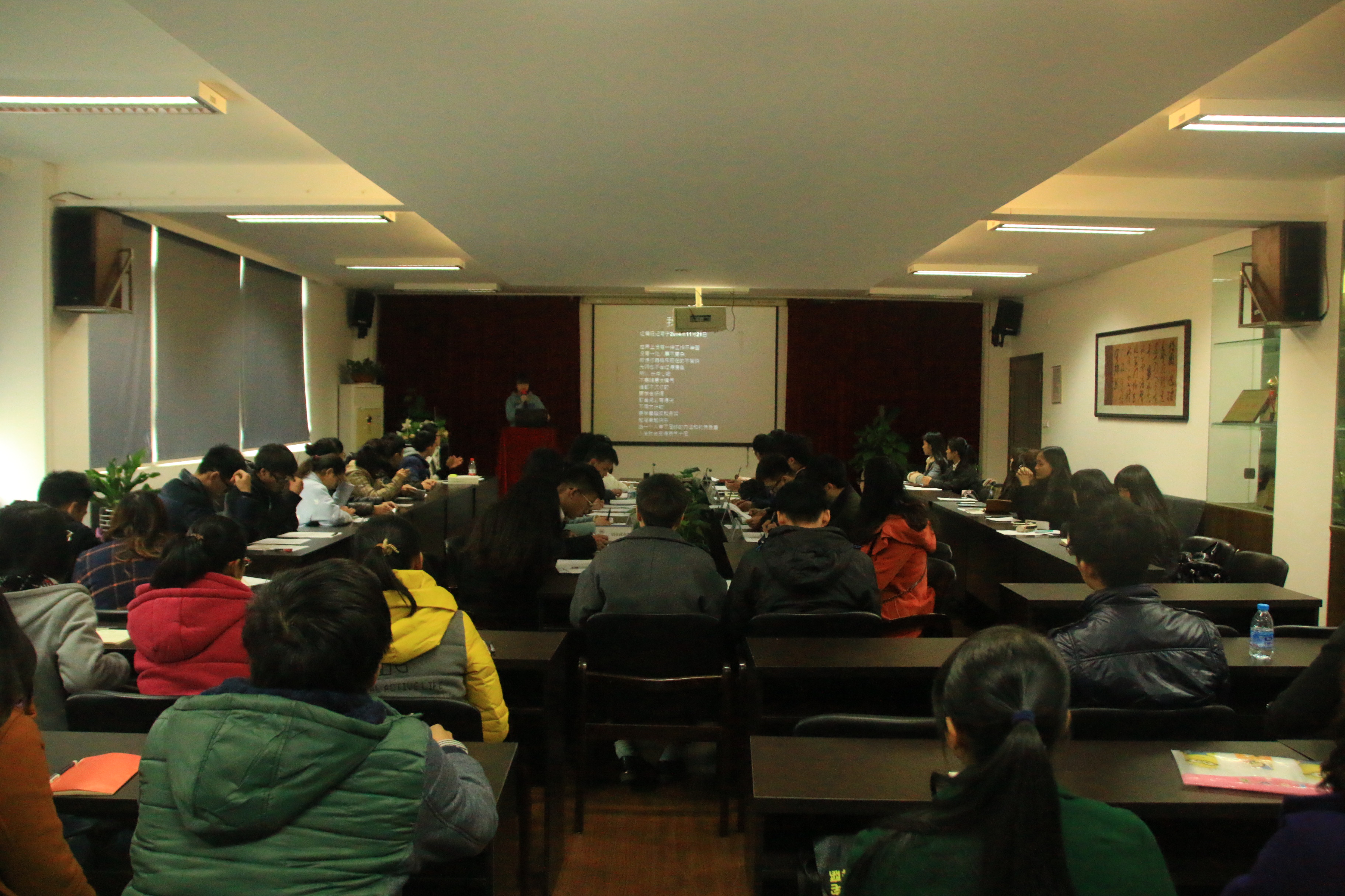 1月7日下午,时时彩 团委学生会在2B4001召开本学期第四次全委会暨“星级部门”、“每月之星”的评比。参加此次会议人员有时时彩 团委书记叶如芳,辅导员杜茜、陈赛慧,研究生学姐李艳燕,团委副书记金李斌、学生会主席吴荣婷、学生会副主席叶佳颖、冯瑜瑜以及各部门部长与干事们。