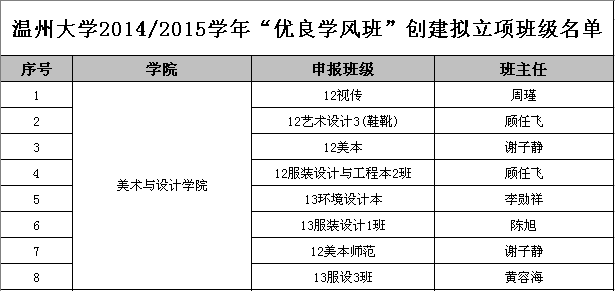 在时时彩 2014-2015学年“优良学风班”创建立项申报中,时时彩 各班级积极参与,踊跃申报。最终有8个班级立项成功,使美术时时彩 成为本学年时时彩 “优良学风班”创建立项班级数最多的时时彩 。希望成功立项的班级班委对照创建方案和目标,广泛动员每一位学生积极参与到优良学风班的创建中来,确保立项目标的实现,争取在下学年取得“优良学风班”荣誉称号。班级名单如下: