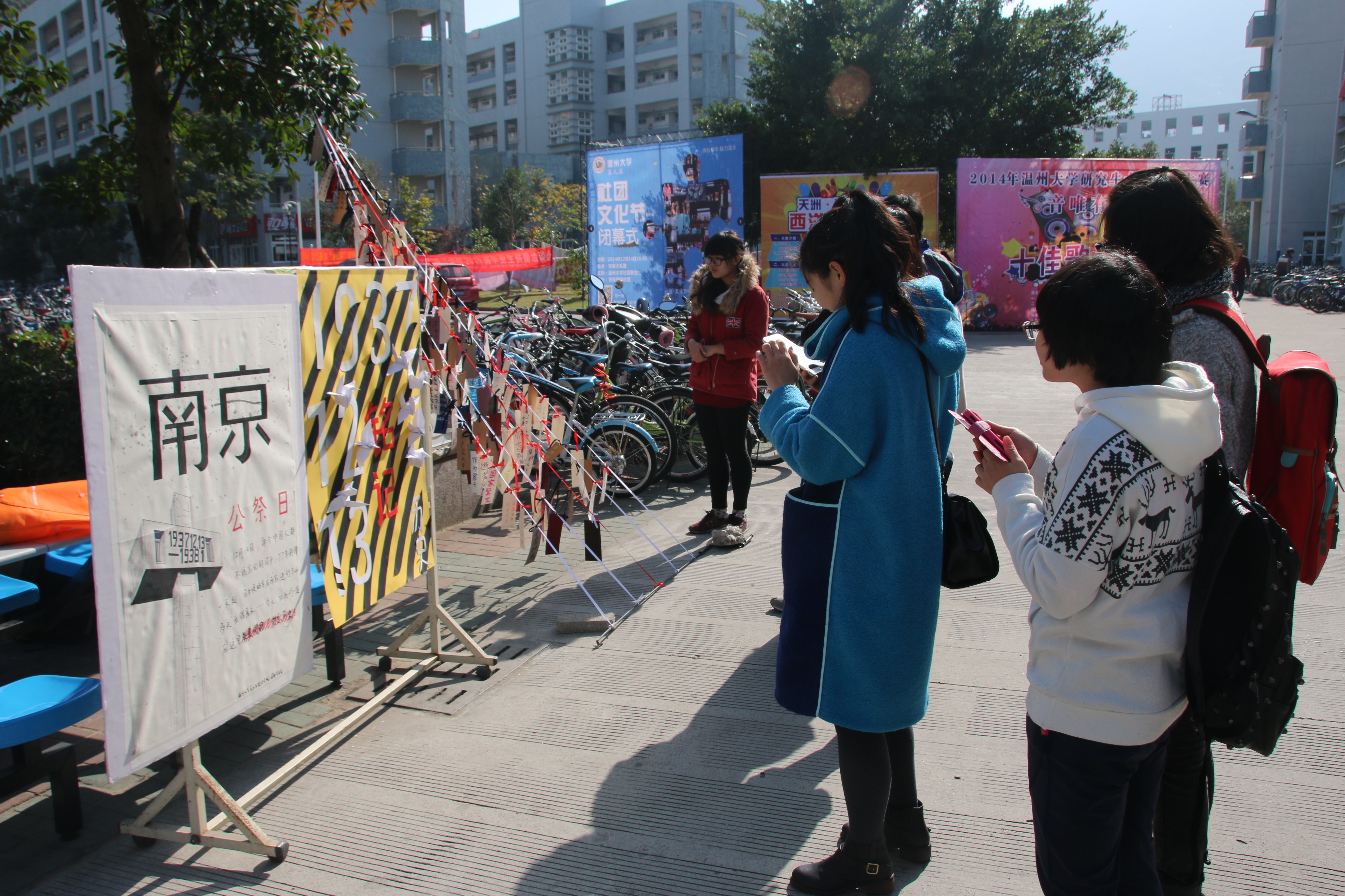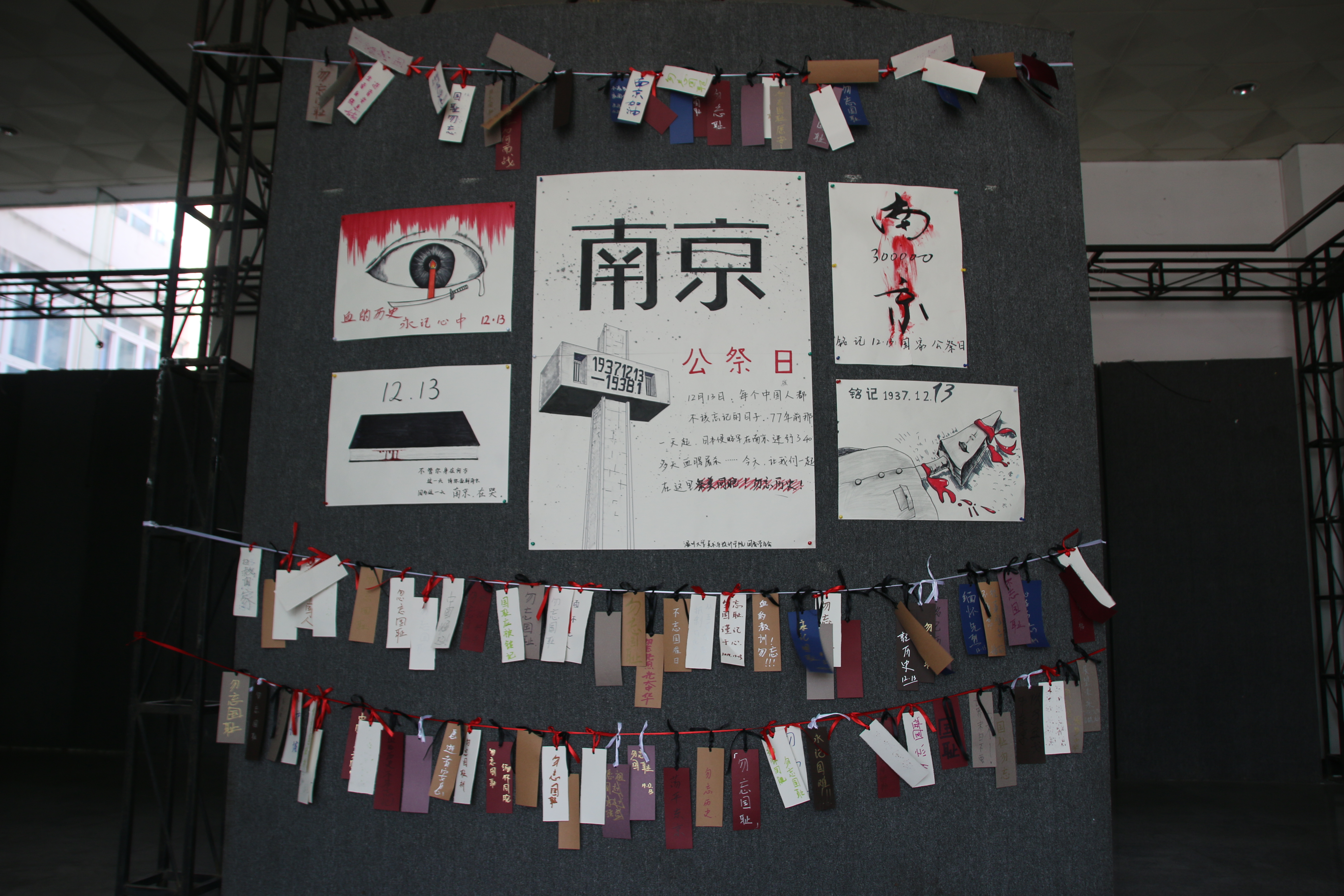 12月13日当天,时时彩 团委学生会创业就业部与学风纪检部为响应本次国家公祭日,在超豪学区开展举办了祭语公祭悼念活动。本次活动展出了两张手绘悼念大海报及多张手绘宣传公祭漫画,同时开展了温大学子亲手写寄语、挂祭语活动。一同为南京大屠杀遇难人民哀悼,缅怀抗日先烈,勿忘国耻,铭记历史。