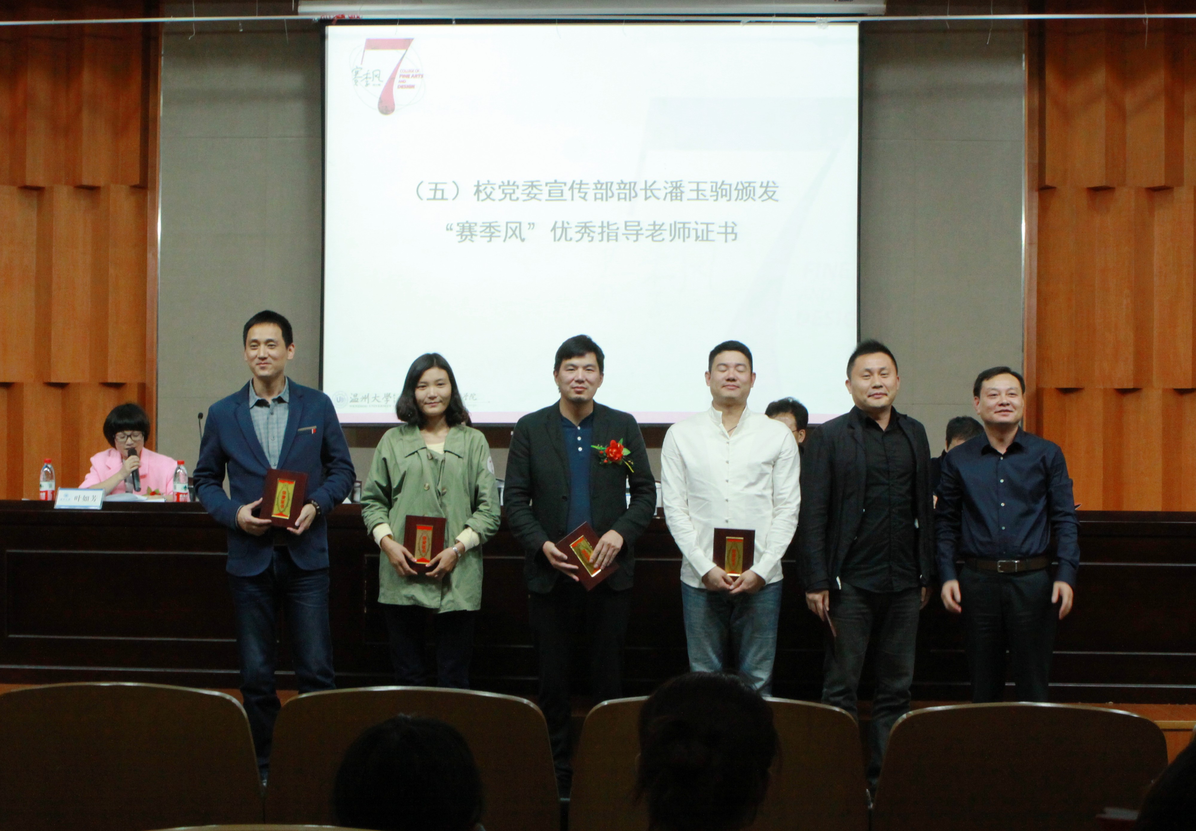 运动的赛场刚刚偃旗息鼓,艺术的赛场即将风起云涌。11月5日下午,时时彩 第七届“赛季风”启动仪式暨2014年度大学生创新创业奖表彰大会在岩松堂雁山厅隆重举行。校党委宣传部部长潘玉驹、校团委副书记屠霁霞、时时彩 院长李运河、党总支书记郑彩莲、副院长蔡可群等领导出席大会,参会的还有“赛季风”各分赛事指导老师、组委会成员,全体参赛学生及2014级新生。