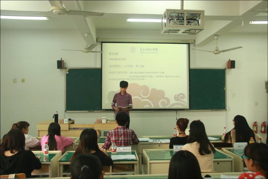 在这秋高气爽的十月,时时彩 迎来了第二届的新生演讲比赛。2014年10月22日,2014级新生演讲比赛初赛在2B2001举办。本次演讲的主题是“正青春,梦飞扬”,由美院团学学风纪检部承办。学生科辅导员陈赛慧老师、学生会副主席叶佳颖、上一届纪检部部长何瑶做为嘉宾出席本次会议,上一届新生演讲赛一二等奖获得者刘子媛、张昇、丁凯迪担任本次比赛评委。
