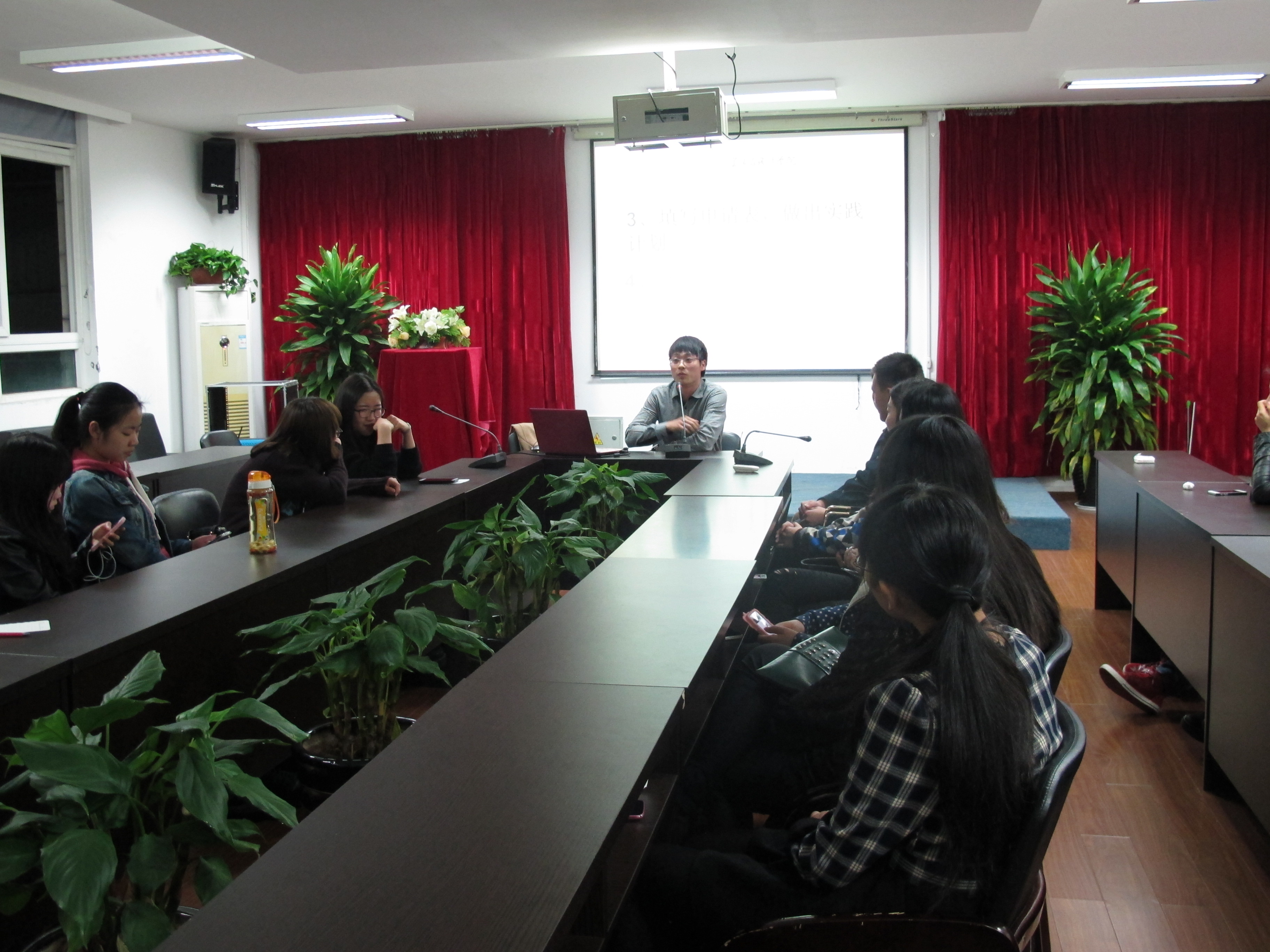 首先,金李斌副部长就暑期社会实践的具体申报流程和组织安排为在座的大一学生做了讲解,随后他用PPT展示了上届暑期社会实践团队的优秀成果,他鼓励同学们要结合自己所学知识,积极策划,学以致用,多开展一些有创新有意义的实践活动,将理论与实践充分结合,真正锻炼出自己的能力。