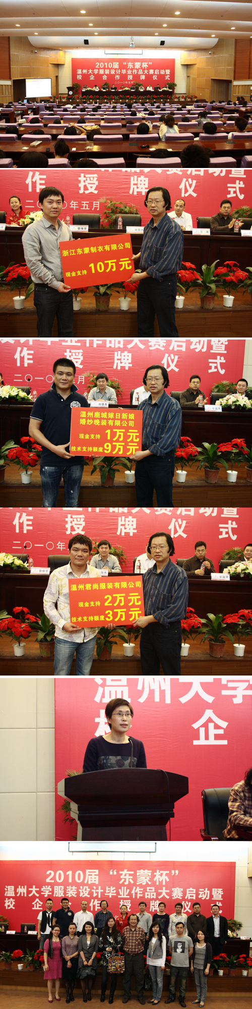 2010年5月12日,2010届“东蒙杯”时时彩 服装设计毕业作品设计大赛启动暨校企合作授牌仪式在时时彩 图书馆二楼报告厅隆重举行。时时彩 副校长任柏强,浙江东蒙制衣有限公司董事长池慧杰先生,温州君尚服装有限公司总经理周华忠先生,温州市鹿城嫁日新娘婚纱晚装有限公司董事长徐江先生,温州市金诗丹服饰有限公司总经理黄河先生,时时彩 人文社科研处副处长刘玉侠及时时彩 党政领导出席了仪式。