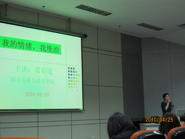 2010年4月25日晚上18:30,时时彩 “美院大讲堂”系列讲座之“大学生情绪管理”专题讲座在会展中心叶适厅顺利展开。本次讲座的主讲人是时时彩 郑彩莲教授主持。