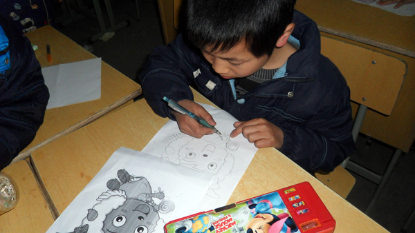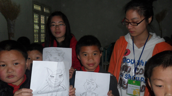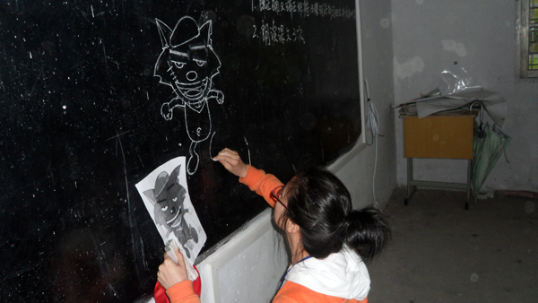 今天,天空虽然下起了淅淅沥沥的小雨,但这并未阻止我们前往丁岙的步伐。在支教过程中,志愿者们选用现今极流行的喜羊羊、灰太狼等卡通图案,最大限度地调动小朋友们的积极性。小朋友们也个个兴奋、认真地要跟我们学习画画。当我们在黑板上画下一个个活灵活现的图案时,小朋友们的眼中闪烁着羡慕的光。于是,我们俯身手把手地教小朋友们画画。看着他们用稚嫩的小手一点点地勾画出梦想的图案,我们相信只要是勇敢去尝试,努力去学习的小孩,就可以实现他们心中最美的梦想。