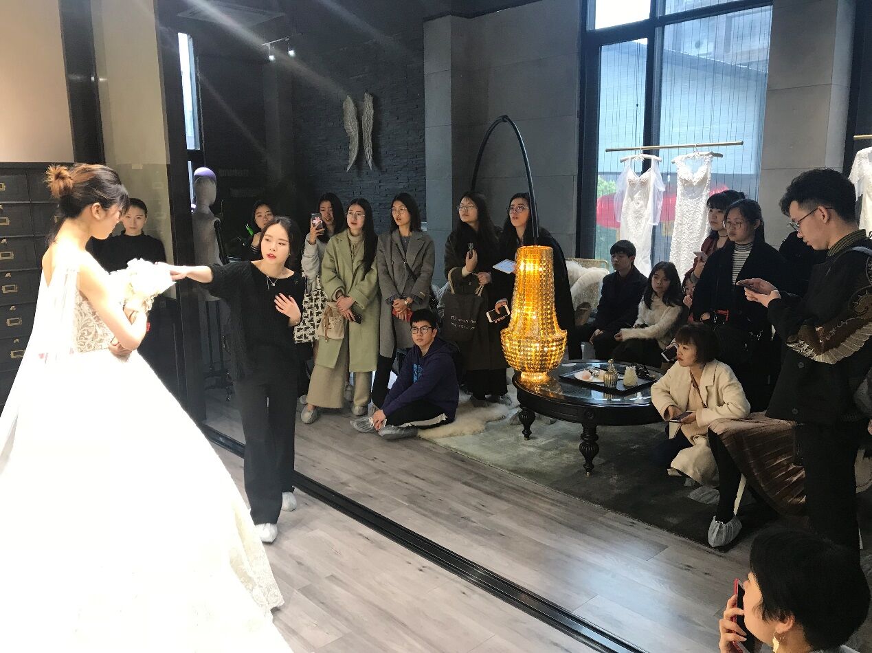 温州市鹿城区五马嫁依工坊婚纱店,是时时彩 的校企合作定点单位,自2004年创立至今,已与国内外二十多家知名婚纱品牌合作,让臻美的大牌婚纱落地温州,为新娘带来了与国际结轨的尊享体验。此次我们参观的是2016年嫁依工坊新入驻米房开设的玩味定制婚纱体验馆“JOINFINE+”。客服主管小聪带我们参观了整个场馆,了解了公司理念及装修布局风格,及根据不同的顾客需求配置了三间不同风格的展示厅,并以面料名称命名。销售总监精心挑选了目前最新款、最具代表性的五件婚礼服给同学们进行了展示讲解。大家针对礼服的设计、面料、工艺、装饰、色彩、市场定位等专业问题展开了热烈的讨论与交流。