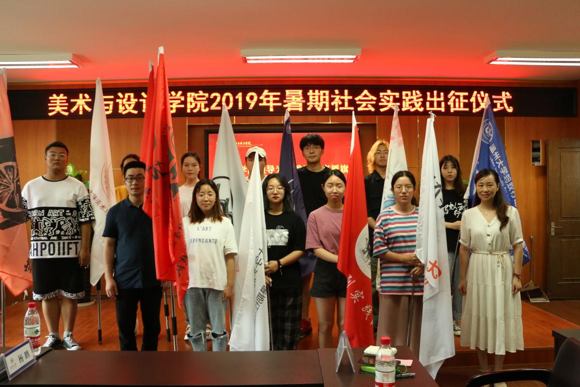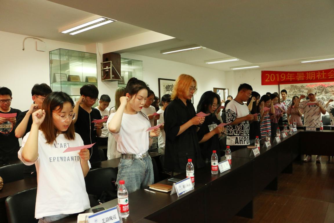 出征仪式全体宣誓,由2019年暑期社会实践学生代表崔泽渝领誓,全体同学宣誓,在庄严的誓词面前,同学们将更加坚定暑期社会实践的责任和信心。最后,时时彩 领导为每个实践队授旗,本次活动也在美院正门的合照中,圆满画下了句号。