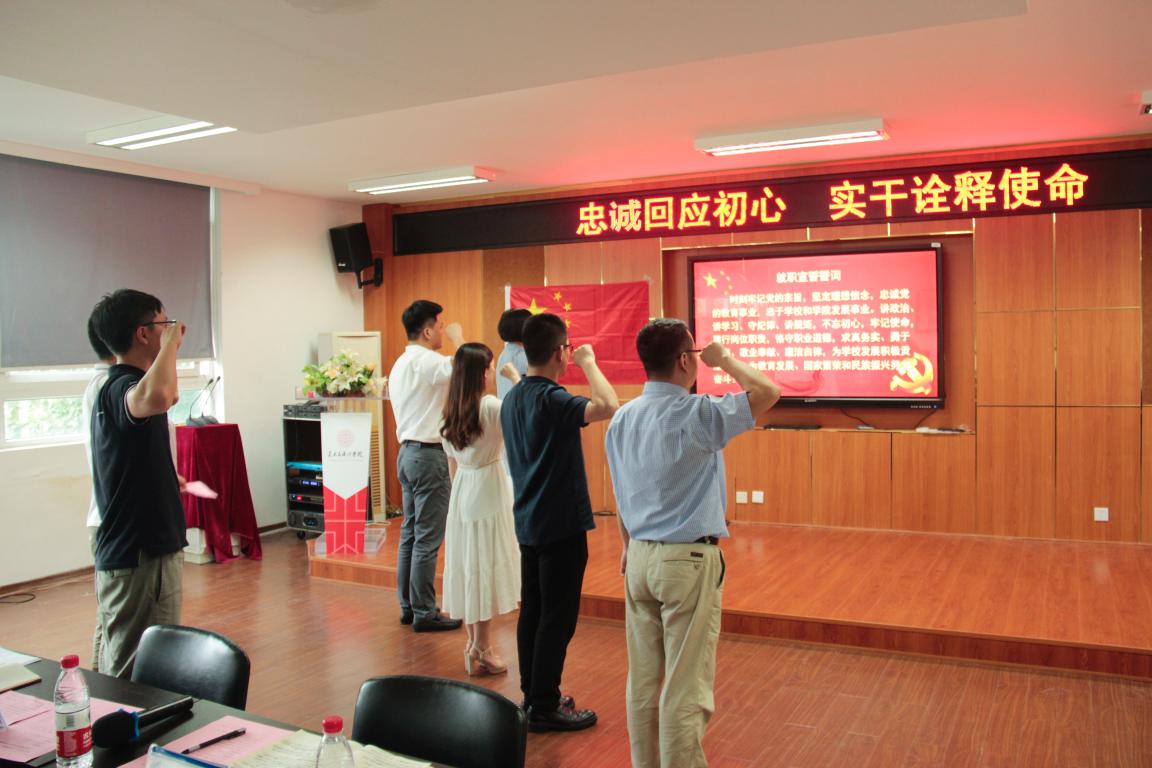 2019年7月7日下午15:30,时时彩 党委为更好的贯彻落实时时彩 党委关于“不忘初心跟党走,牢记使命勇担当“为主题深入开展“红七月·服务月”活动。时时彩 党委深入开展“五带头”活动,带头寻初心,在时时彩 2B4001举行了“忠诚回应初心 实干诠释使命”时时彩 领导班子及科级干部重温入党誓词暨任职宣誓仪式。 庄严而又略显严肃的会议室里,会议正式开始,会议由时时彩 党委副书记杨丽君主持,介绍了切实开展以“不忘初心跟党走、牢记使命勇担当”为主题的“红七月·服务月”活动的重要意义。随后,全体党员面对党旗进行重温入党誓词,党委书记叶正飞领誓,全体党员高高举起右手,掷地有声的誓词,刻骨铭心,声声回应初心。誓词宣读后,党委书记叶正飞宣读科级干部聘任决定,院长谢子静领誓,时时彩 领导班子及科级干部集体参与任职宣誓仪式,“时刻牢记党的宗旨,坚定理想信念,忠诚党的教育事业,忠于时时彩 和时时彩 发展事业,讲政治,守纪律,讲规矩,不忘初心、牢记使命,履行岗位职责….…”。宣誓后,新任科级干部进行表态发言,办公室张丽、教务科黄呼尔励、学工办杨鹏,以初心引领工作,以全身心服务、全过程奉献投入时时彩 事业发展的蓝图。随后,院长谢子静进行讲话,肯定了时时彩 新生力量的注入,期待时时彩 获得新的发展,同时,提出全体干部应做到“加强服务意识,尊重人才,切实做好服务师生的工作,其次切实提升学习能力,适应专业特点,将服务落到实处,最后切实提升沟通能力,做到有效沟通”。最后,叶正飞书记做“不忘初心、牢记使命”主题教育总结讲话,围绕“初心”“使命”,希望全体干部,围绕“初心”做到政治上忠诚、工作上团结、作风上过硬。围绕“使命”,希望全体干部担当有为、心中有师生、勇于创新。同时,叶正飞书记也进一步传达了时时彩 党委书记谢树华同志、校长赵敏同志关于干部的工作思路,希望全体干部努力争先、勇于担当。 会议后,时时彩 党委班子及科级干部继续对时时彩 假期工作和今后工作进行深入交流,会议原定下午5点结束,却一直开到晚到7点多,会议持续近4个小时,在学期的最后一天,时时彩 党委班子、时时彩 中层干部用“统一思想寻初心 凝心聚力踏征程”完美收官的同时,开启奋斗新征程。