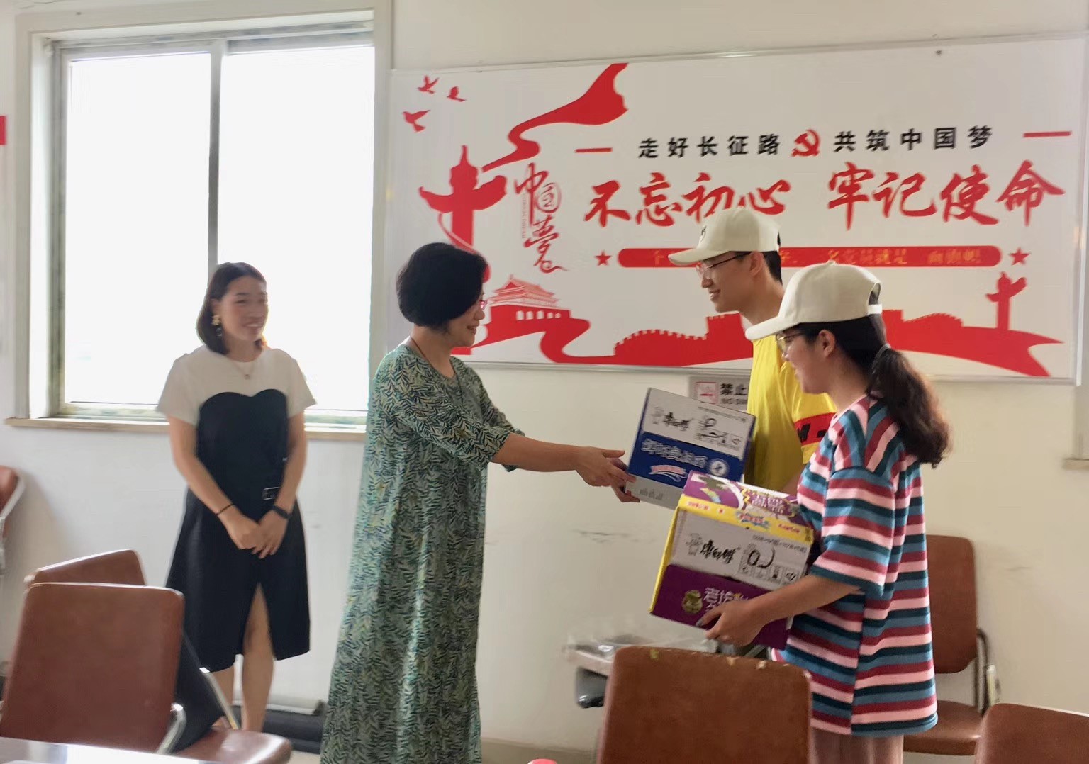 慰问合照 “大手牵小手”暑期社会实践队是一支由人文、化材、建工、数电、外语和美术等时时彩 学生组成的暑期实践队,共有25名学生。该队伍致力于服务和关爱留守儿童和空巢老人,队伍通过探访,宣传,问卷调查以及支教等形式来开展社会实践活动。2019年7月16日上午9时许,时时彩 美术时时彩 院长谢子静、副书记杨丽君慰问了正在茶山街道梅泉社区开展活动的“大手牵小手”暑期社会实践队。 “大手牵小手”支教活动现场 初到礼堂,谢院长一行受到了实践队队长及队员的热烈欢迎。随后,在队长的带领下,谢院长参观了小朋友们的上课地点及活动场所。参观完毕,谢院长、杨书记在会议室与支教队员进行了亲切的面对面交流。 谢院长、杨书记与队员亲切交流 首先,谢院长对实践工作给予了高度评价,对支教队员的表现给予充分肯定。随后,各队员分享了各自的收获与思考。“陪伴老人一天做了1600个饺子,有点辛苦,但是看到老人们开心的笑脸,我们也很欣喜!”“从老人院实践回来,我马上给奶奶打了电话,关心奶奶身体、问候奶奶。”“通过近一周时间的实践和相处,我感受到一个团队的沟通合作非常重要!”……大家畅所欲言,会上谈论氛围热烈。而后,杨书记也对于关爱老人和留守儿童阐述了自己的看法,鼓励与支持大学生走进基层参加实践,并于实践中锻炼成长。最后,谢院长为实践队员送上慰问品并强调了大学生暑期社会实践的重要意义,鼓励大学树立责任意识和奉献精神,利用好自己的学科优势,多思、多问、多想、多看,通过社会实践,长见识增才干。 谢院长送慰问品 谢院长总结讲话 谢院长的慰问给实践队员们带来了精神鼓舞,让队员们在接下来的实践活动中充满干劲,亦明白了青年大学生背负的时代责任和历史使命。