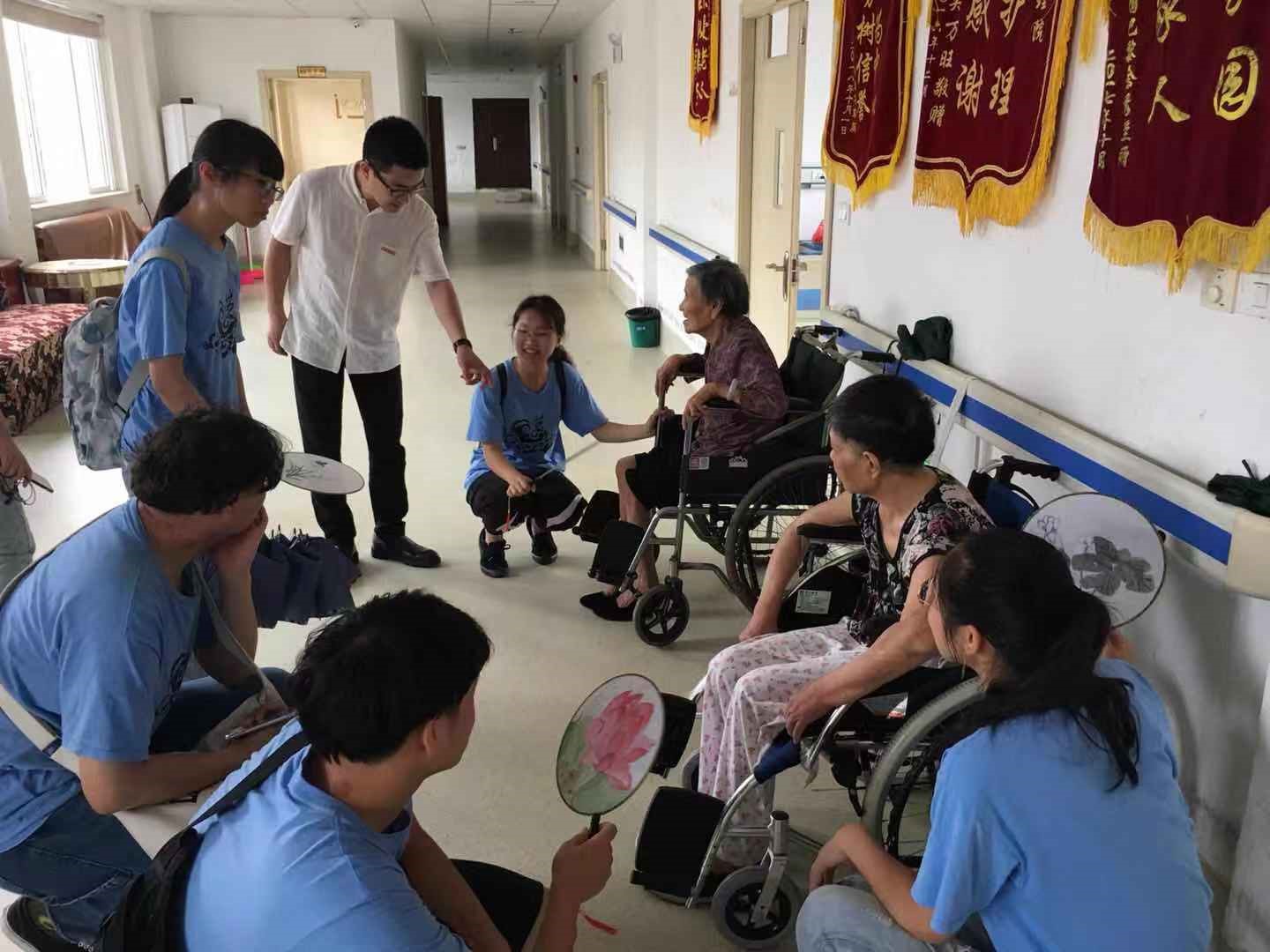 由于二楼的老人在睡觉,胡院长分别看望慰问了一楼和三楼的老人。看到队员们和一些可以表达的老人聊家常,胡院长也饶有兴趣的和老人交谈,关心他们日常的生活。老人们也很愿意和队员们聊天,一位老人聊自己的子女,满满的自豪感,讲到自己的子孙在国外,之前家里给请保姆,不过照顾不好,所以来了这里。还有位很和蔼的老奶奶,一直笑着,还很亲切的关心我们,问我们吃饭了没。还有一些队员给手脚不好的老爷爷按摩搓手,一位老爷爷有中风,护理阿姨做了拉伸运动后,老爷爷痛得捂着手,队员们见状便给老爷爷搓搓手,缓解疼痛。实践队员们一边关心老人,一边也把自己做的扇子送给老人,聊表心意。