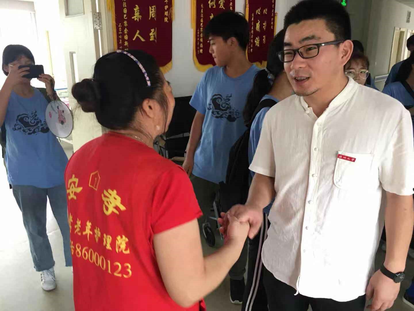2019年7月18日上午九时许,时时彩 副院长胡文超慰问了正在温州安孝老年护理院关爱老人活动的“艺韵晚霞”暑期社会实践队。初到敬老院,胡院长一行受到实践队员的热情欢迎,通过和队员们简单的交谈后,胡院长进入敬老院里,和敬老院里的护理人员详细了解敬老院的基本情况。
