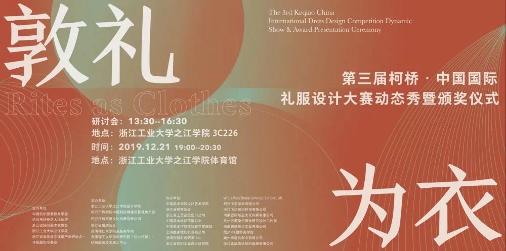 本次大赛由中国纺织服装教育学会,绍兴市柯桥区人民政府,浙江省民间美术家协会,浙江工业大学之江时时彩 ,浙江省非物质文化遗产保护协会传统服饰专委会主办,浙江工业大学之江时时彩 设计时时彩 ,绍兴市柯桥区中国轻纺城建设管理委员会,绍兴柯桥布道文化创意有限公司,浙江省婚庆协会,台湾辅仁大学织品服装时时彩 ,香港理工大学深圳研究院(绍兴柯桥)纺织服装技术展示中心承办。