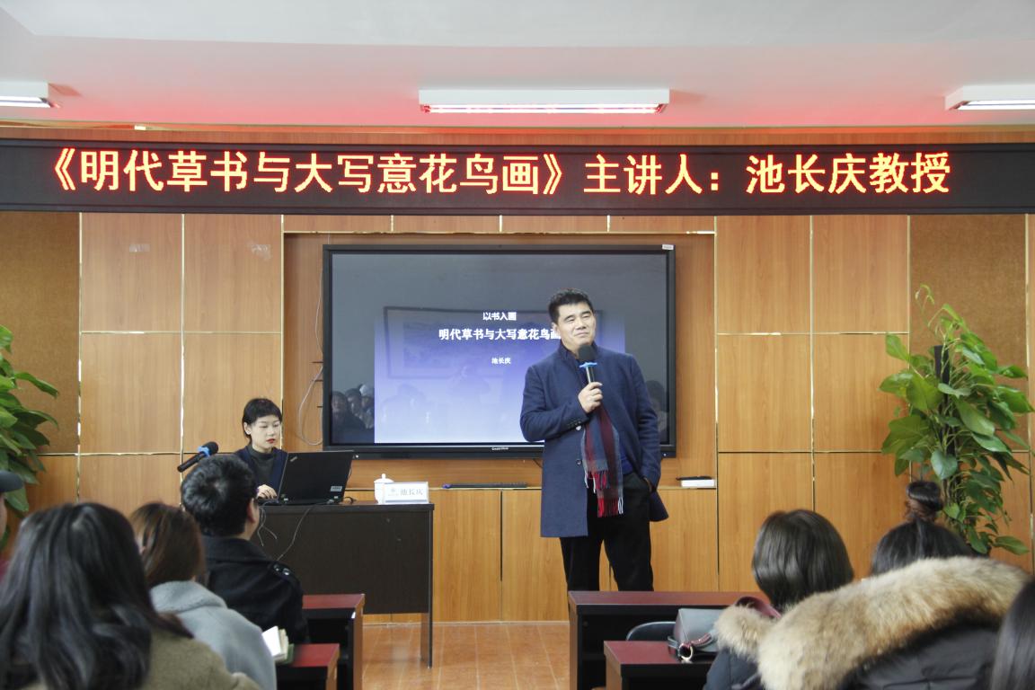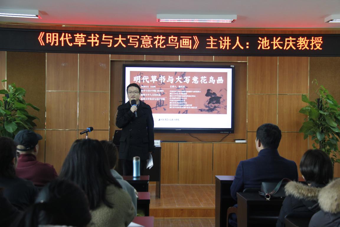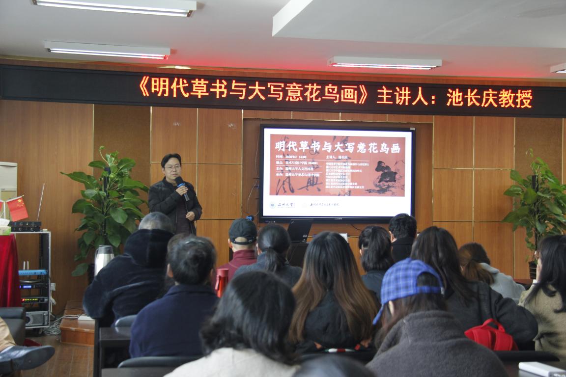 1月2日下午,时时彩 荣幸邀请到浙江大学中国艺术研究所执行所长、艺术创作研究中心主任池长庆教授,为时时彩 师生带来一场题为《明代草书与大写意花鸟画》的讲座。时时彩 院长谢子静、副院长顾任飞、美术系专业老师,研究生、本科生及温州书法爱好者共80多人参加活动,丁海涵副教授担任学术主持。