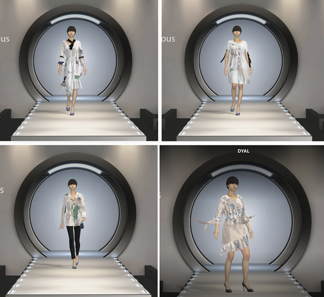 戴上3D眼镜,看着虚拟模特身着设计的时装款款而来,坐在办公室、站在门店甚至居家就能仿佛置身于走秀现场,观赏精彩的时装秀视觉盛宴。据陈明艳教授介绍,虚拟仿真时装秀是模拟传统服装设计开发到发布的一系列过程,技术团队突破传统服装产品开发繁杂流程,以服装艺术设计与高端数字3D虚拟科技为支撑,集传统服装的制版设计、虚拟缝制、试穿检测、面料仿真、动态走秀为一体,直接将设计、样板与缝制联动,生成3D虚拟样衣试穿效果。并且通过虚拟走秀及轮秀编制,让顾客感受到影院式的虚拟时装秀。